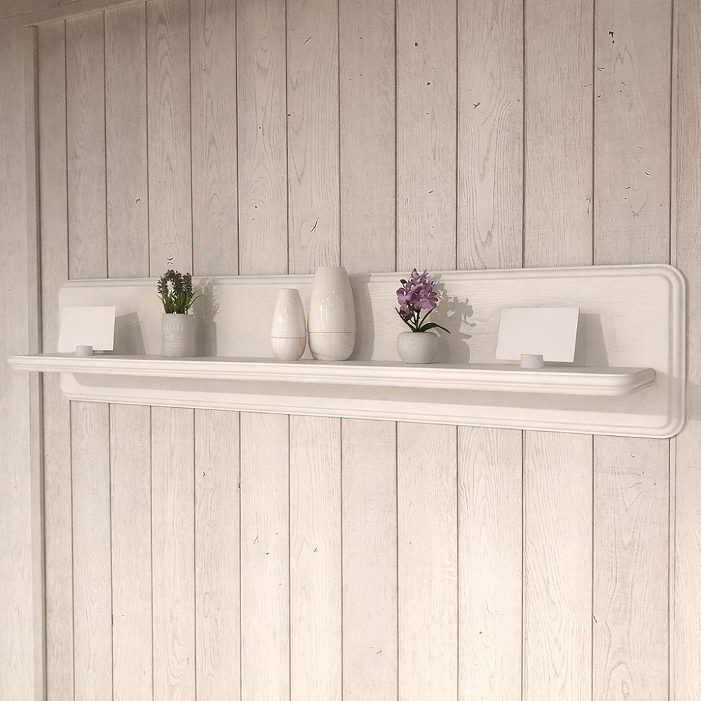 Celá biela polica na stenu (biela časť najmä) je upravená jemným kartačovaním povrchu a kvalitným nástrekom talianskej značky Milesi. Polica na stenu – biela z masívu vyhotovená v Provensálskom štýle zútulní obývačku domu rovnako ako pracovňu alebo študovňu. Biele police na stenu majú mimoriadne vysokú nosnosť na odkladanie kníh, krabíc, škatúľ alebo reproduktorov.