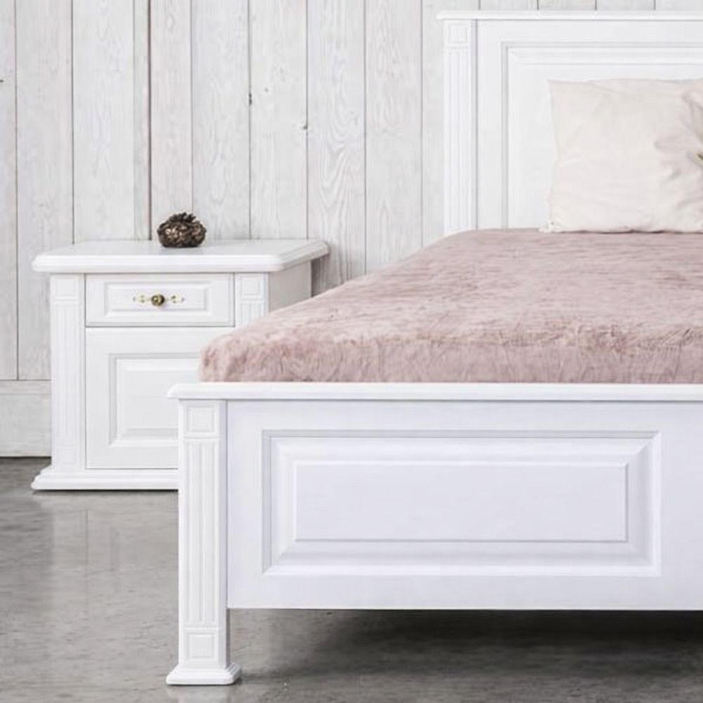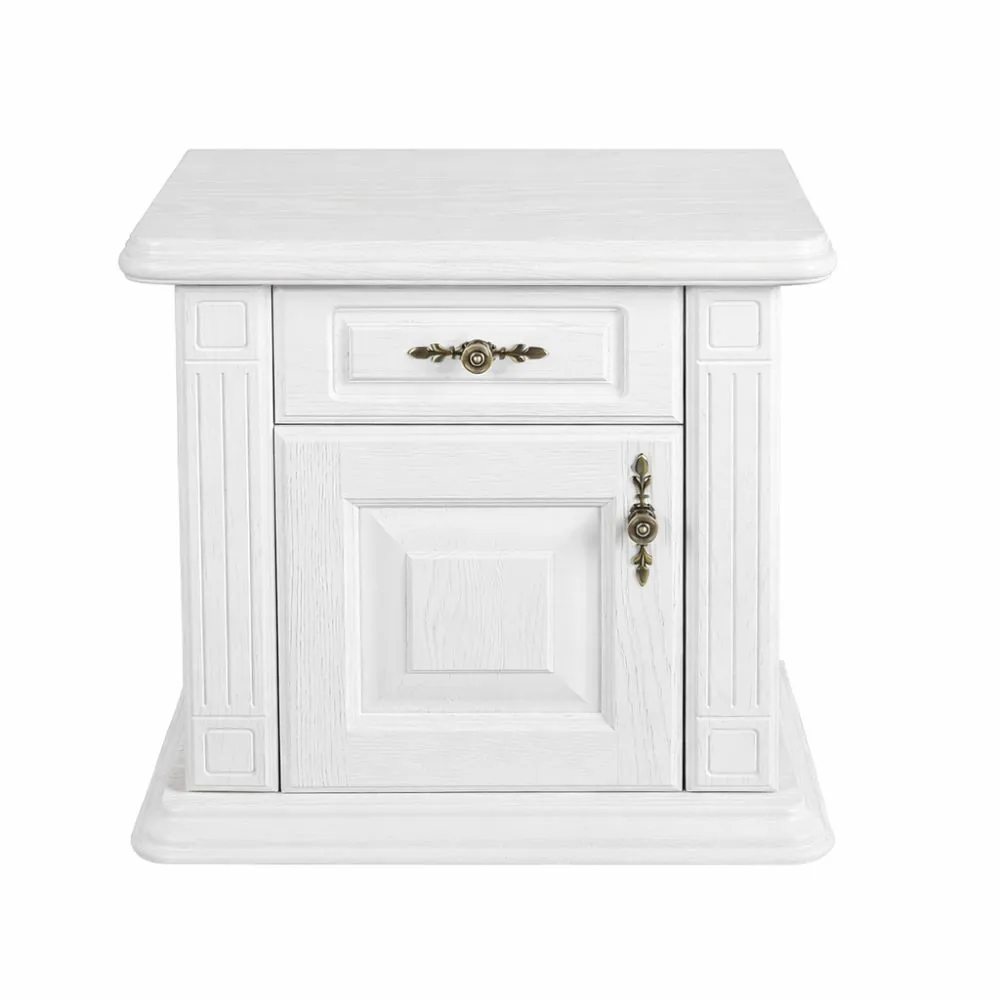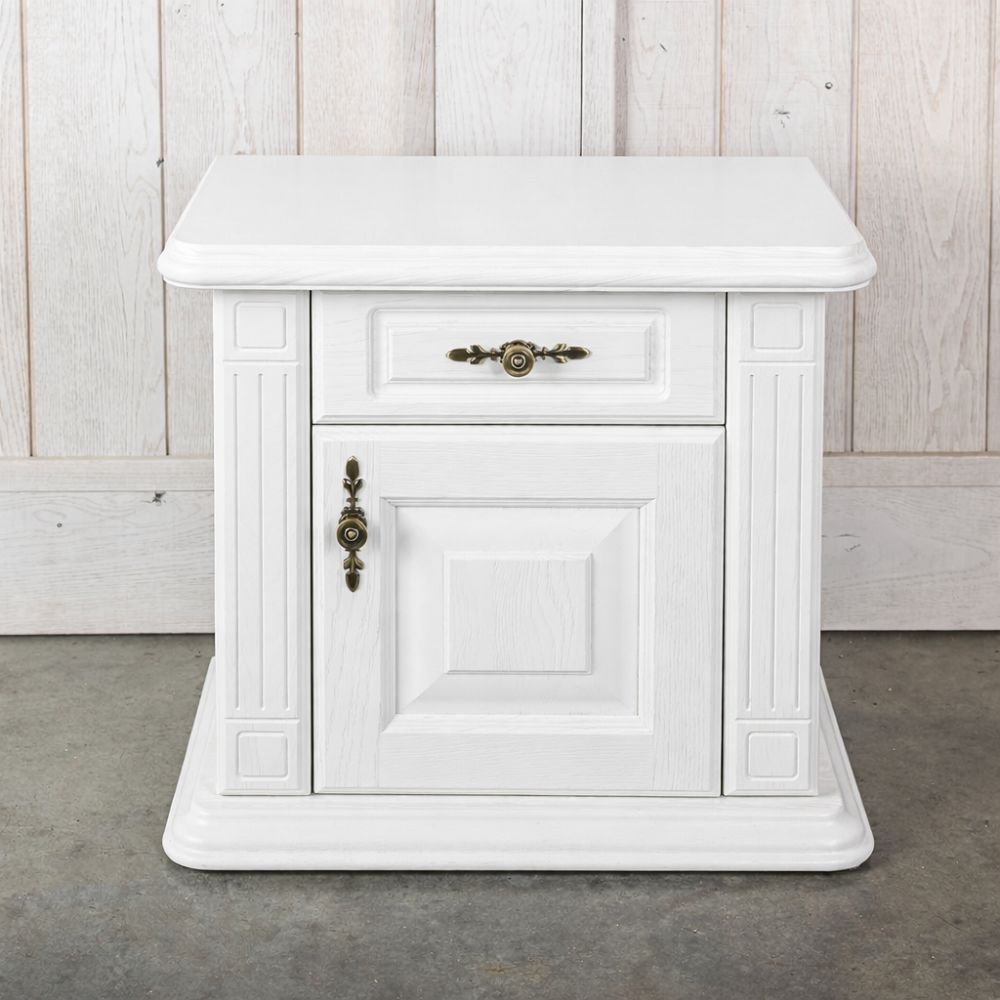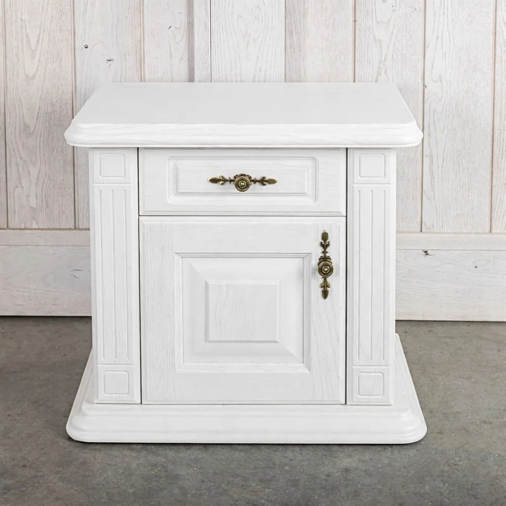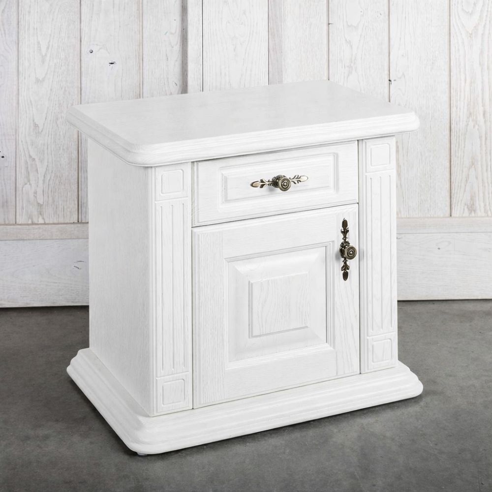 Nočný stolík – biely vo zvyšku tela s krásnym kartačovaným prevedením garantuje vznešený vzhľad. Biele nočné stolíky k posteli sa pohodlne otvárajú a drevené police vysúvajú po kovaní značky Blum. Nočné stolíky biele – masív, dub s klasickou provensálskou textúrou a francúzskym šarmom, ktorým na úchvatnom dizajne pridáva najmä rozšírená spodná základňa bieleho nočného stolíka. Nočný stolík biely lesklý povrch dozdobujú okrasné stĺpiky celého tela stolika k posteli a to vo všetkých častiach bielych nočných stolíkov. Zdobená dubová rímsa a ozdobné antické kovanie na zásuvke bieleho nočného stolíka taktiež decentne podčiarkuje originálny dizajn nočného stolíka, čo dodá jedinečný kus celej spálni.