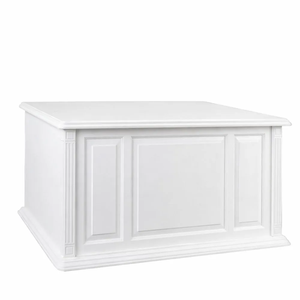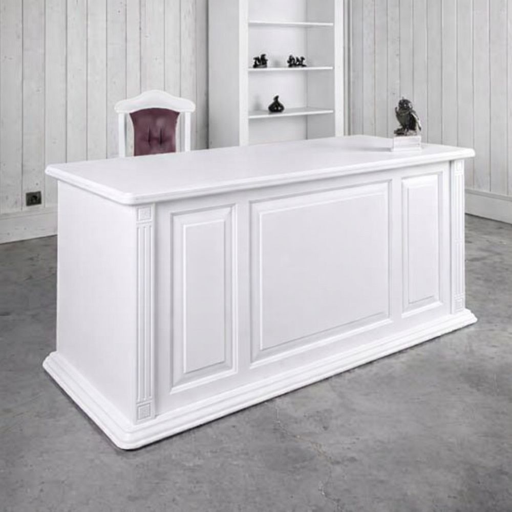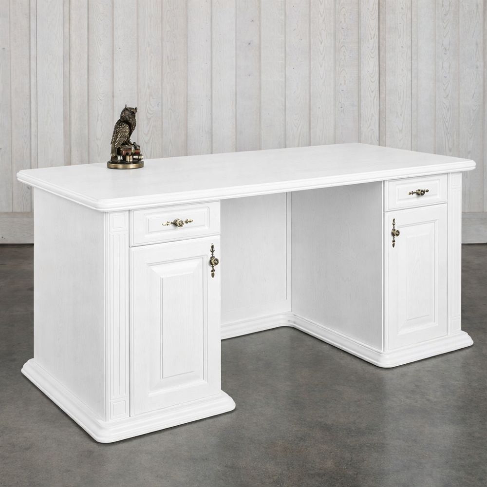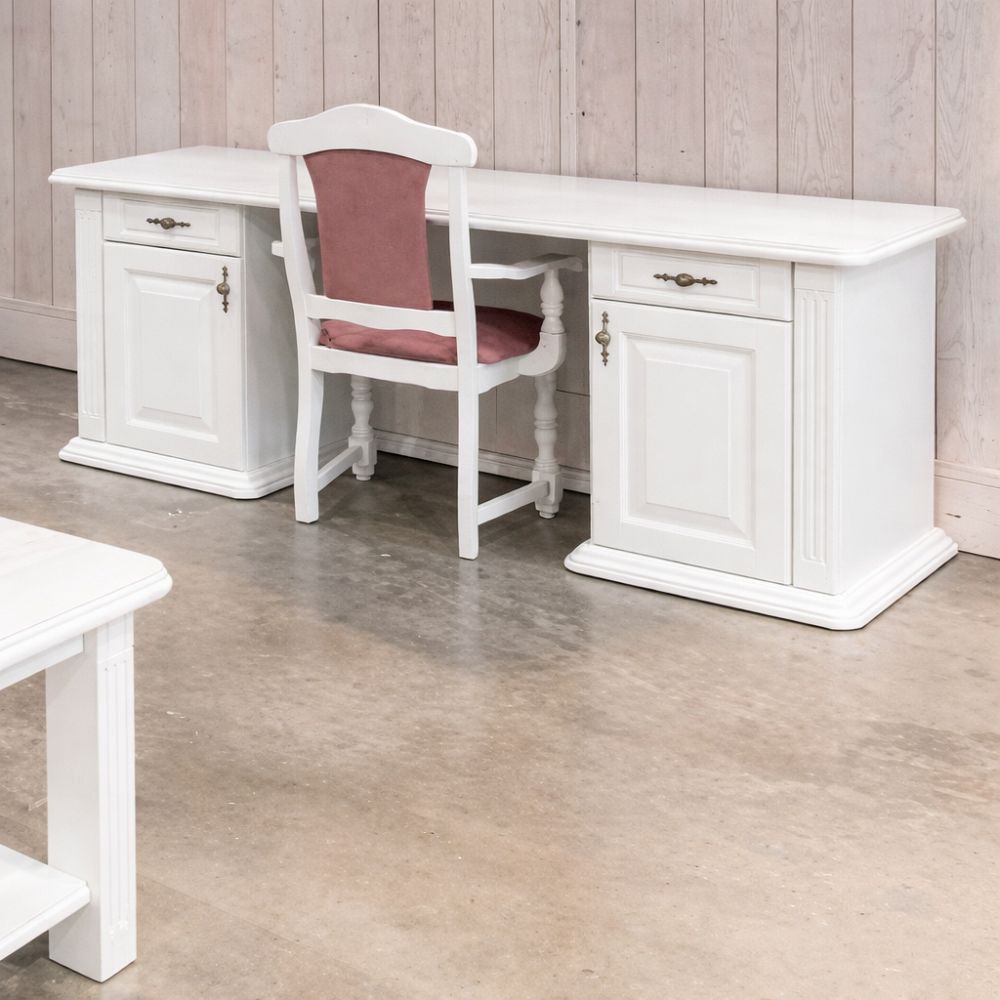 Biely dubový pracovný stôl s klasickou provensálskou textúrou a francúzskym šarmom na dizajne pridáva najmä rozšírená spodná základňa bielych dubových veží, okrasné stĺpiky vo všetkých častiach nábytku ako aj zdobená dubová rímsa či ozdobné antické kovanie na dvierkach stolíka.