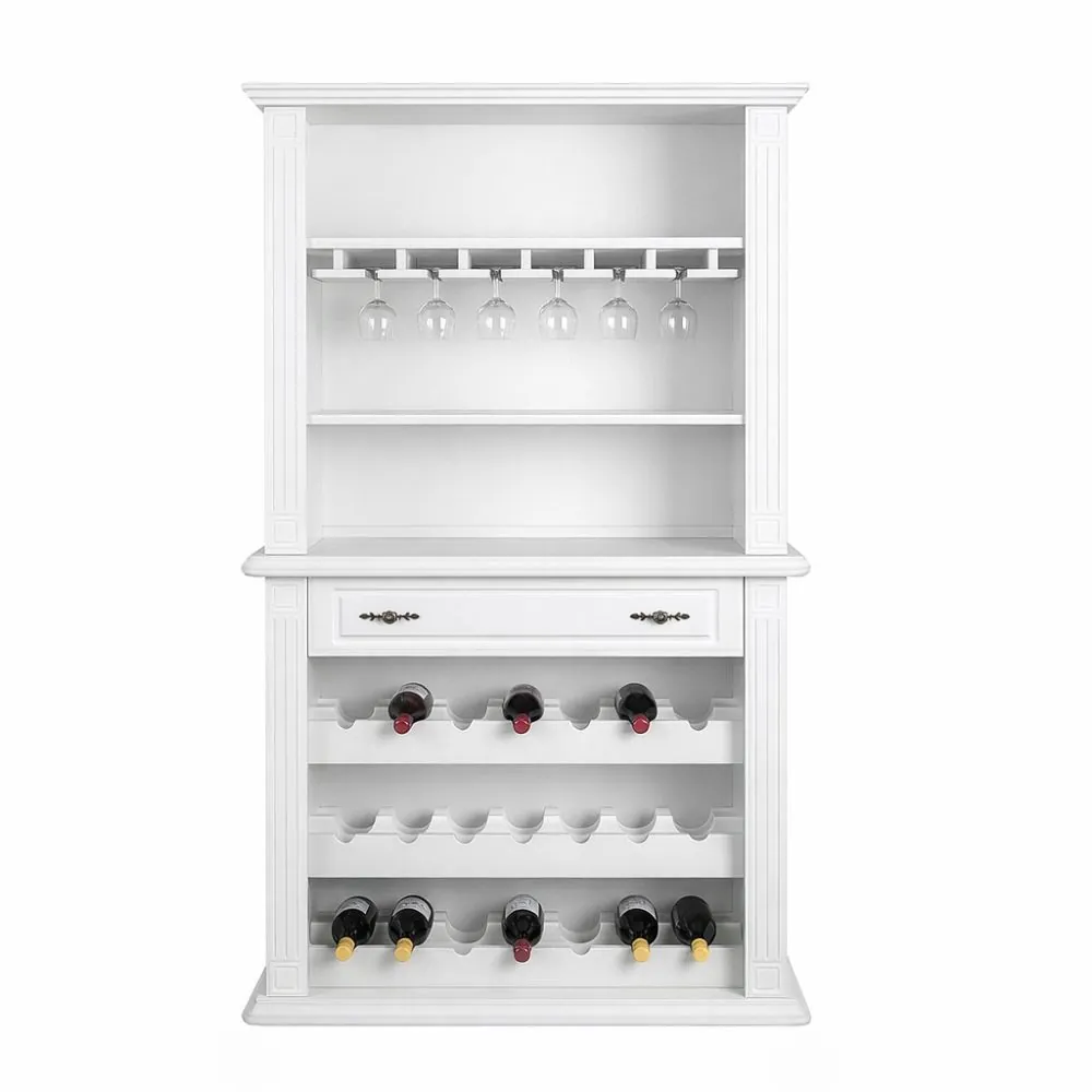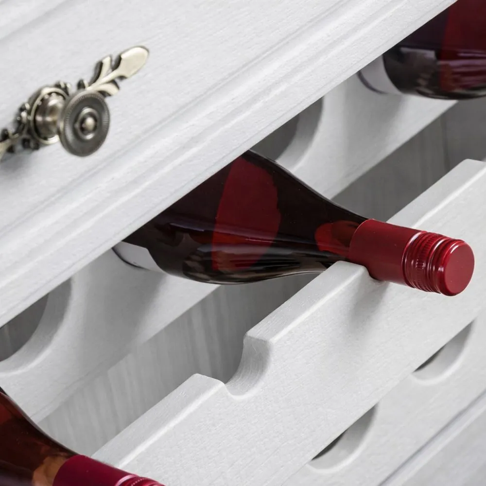 Biely dubový stojan na víno – masív, dub s klasickou provensálskou textúrou a francúzskym šarmom na dizajne pridáva najmä rozšírená spodná základňa komody na víno, okrasné stĺpiky celého stojana na víno a to vo všetkých častiach dreveného regálu na víno. Zdobená dubová rímsa a ozdobné antické kovanie na zásuvke spodnej vínnej komody taktiež decentne podčiarkuje originálny dizajn stojanu na vína. Na montáž celého bieleho regálu na víno je nevyhnutná aspoň dvojica dospelých osôb. Pre bezpečnosť proti prevráteniu dôrazne odporúčame držiak na víno riadne spojiť špeciálnym kovaním, ktoré je súčasťou balenia.