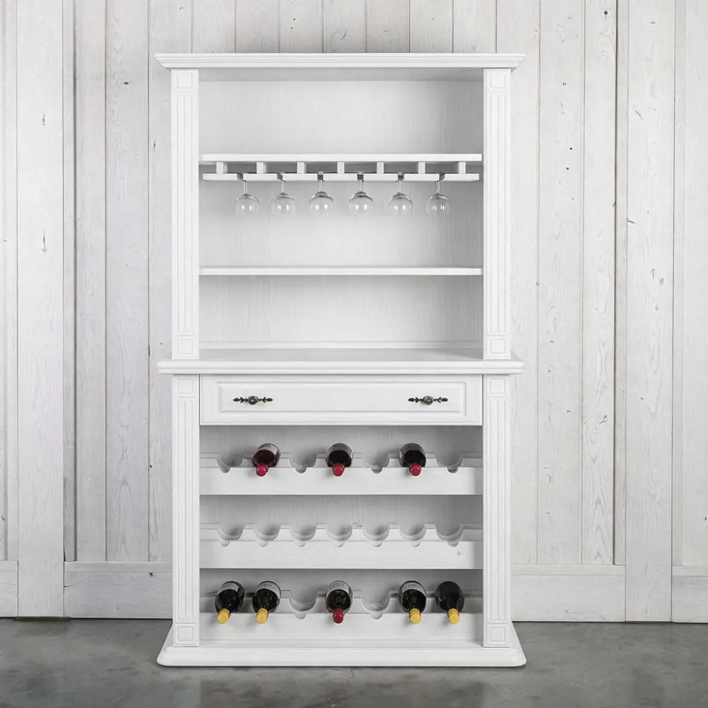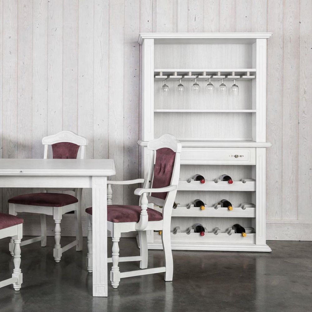 Biely drevený regál na víno je upravený nástrekom talianskej značky Milesi. Biely regál na víno z masívu v Provensálskom štýle zútulní jedáleň, vináreň či reštauráciu s dobrým vínom. Police na víno majú mimoriadne odolnú nosnosť. Komoda na víno s vrchným regálom z dubového masívu je rozložiteľnou zostavou. Dva stojany na víno je možné rozobrať a poskladať koľkokrát budete potrebovať premiestniť pre prezentáciu a konzumáciu dobrého vína.