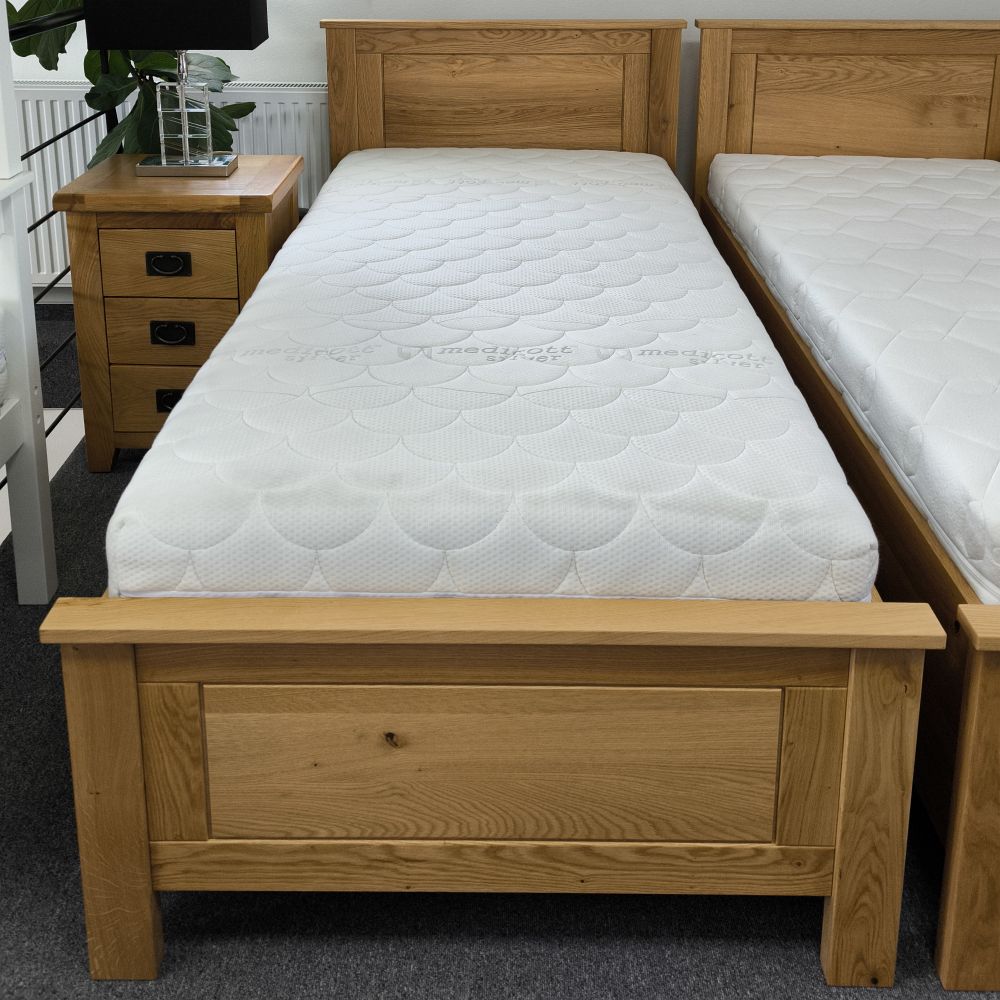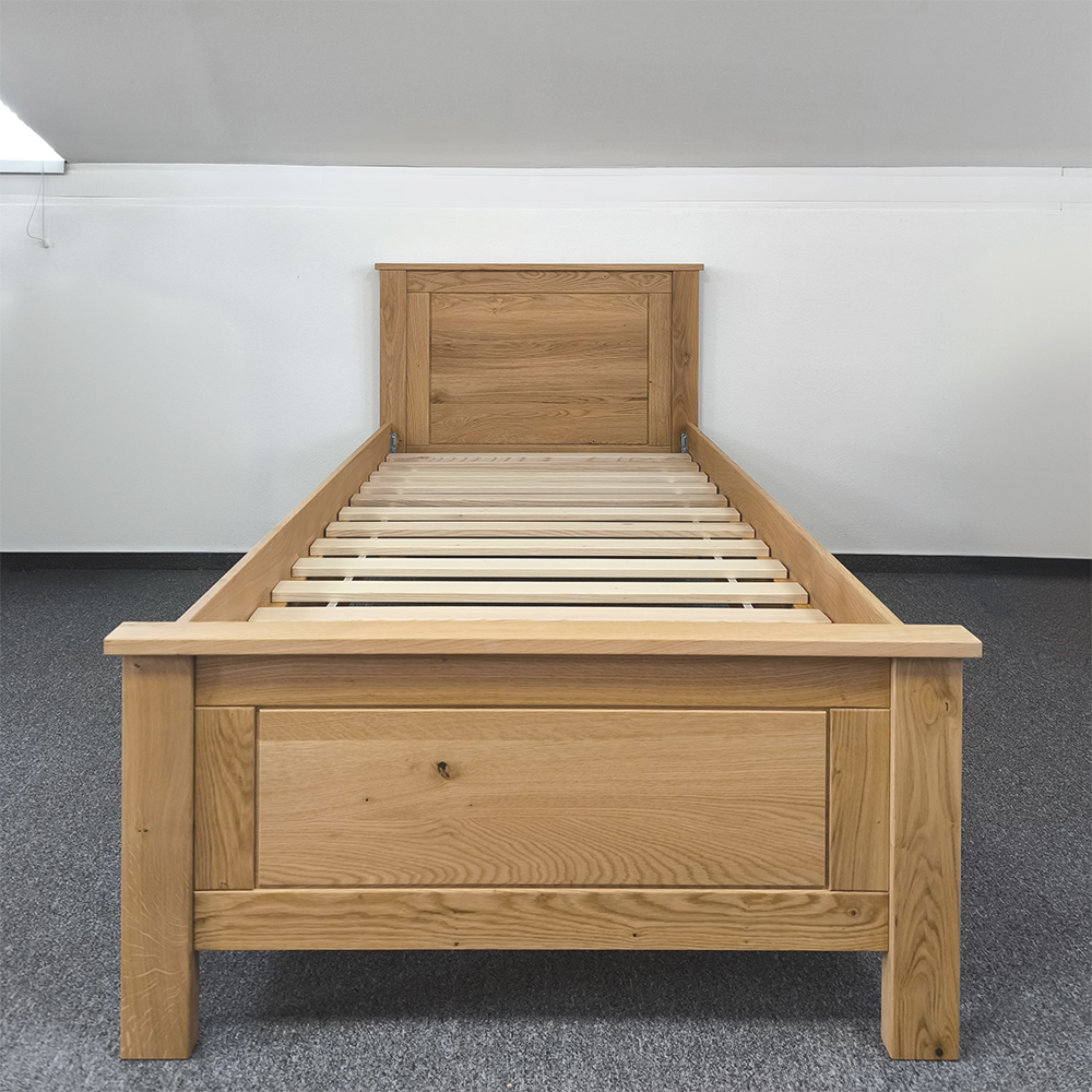 Dub ako prírodný materiál je synonymom kvality a dlhej životnosti. Na rozdiel od laminovaných náhrad je klasická jednolôžková posteľ z masívu stabilná, pevná a odolná voči každodennému opotrebovaniu. Masívna posteľ je vyrobená s dôrazom na detail. Robustný rám, frézované čelá a starostlivo opracované hrany vytvárajú harmonický celok. Spoje sú vystužené kovovým kovaním, čo zaručuje výbornú stabilitu a pevnosť aj po dlhých rokoch používania.