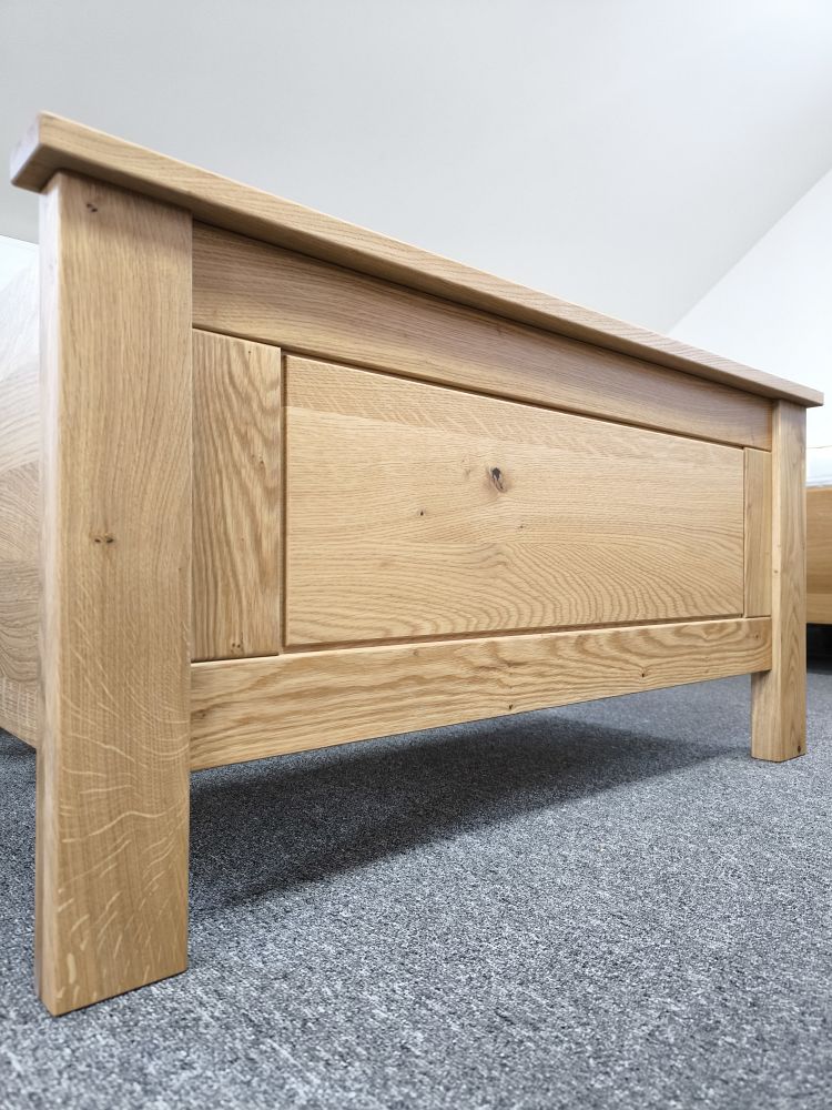 Klasická jednolôžková posteľ z dubu je kvalitná voľba do spálne, detskej či hosťovskej izby. Dubová posteľ sa dá dodať aj s výklopným úložným priestorom. Dubový masív zaručuje posteli stabilitu a odolnosť aj po rokoch používania. Drevená posteľ je vhodná do moderného aj tradičného interiéru.