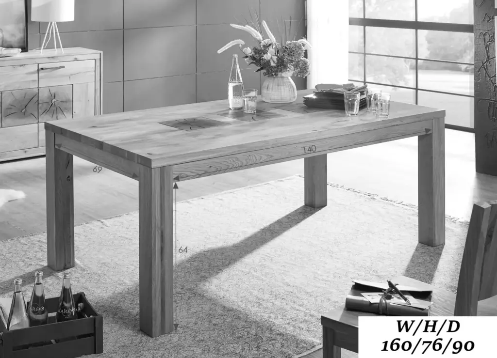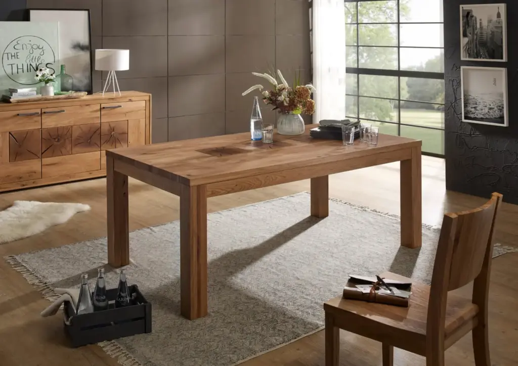 Štýlový pevný jedálenský stôl vyrobený z dubového dreva s rozmermi 160, 180 a 200 × 90 cm poskytuje dlhú životnosť pri všetkých variantoch. Bezfarebný olej zvýrazňuje prirodzenú kresbu a chráni stôl pred poškodením. Nadčasový no zároveň aj rustikálny vzhľad dubového stola s dekoratívnymi prvkami prírodných blokov kmeňa sa člení do moderných aj rustikálnych interiérov.