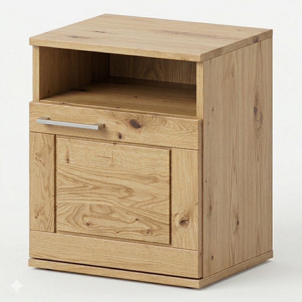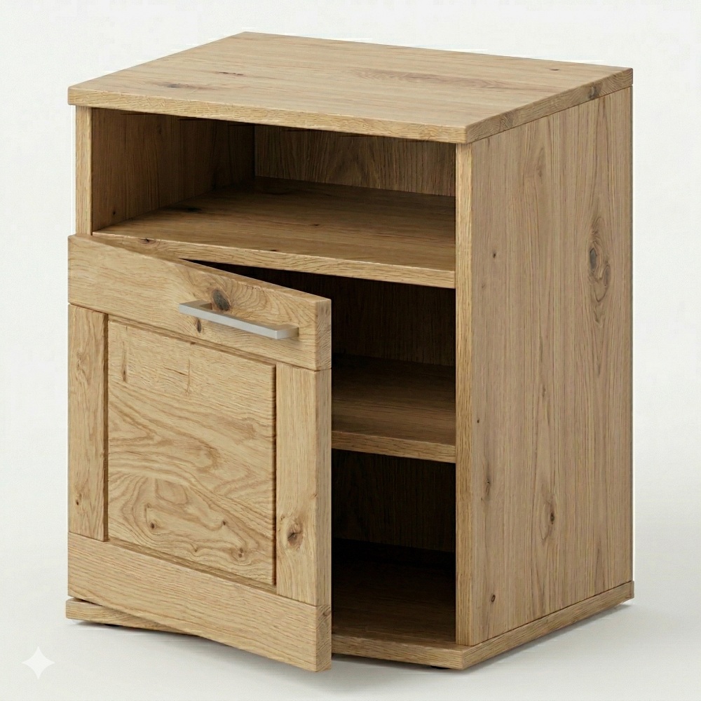 Nočný stolík je vyrobený z mierne rustikálneho dubu, ktorý má charakter a v interiéri nestarne. Každá plocha nesie vlastnú štruktúru, každá hrana potrebuje cit pri opracovaní a každé osadenie musí fungovať s presnosťou. Nočný stolík z masívu stojí na pevnosti dreva, stabilite konštrukcie a remeselnom spracovaní, ktoré dáva zmysel aj po rokoch. Ručne opracované detaily nepôsobia okázalo. Praktická stránka zostáva rovnako dôležitá ako vzhľad. Horná doska vytvára miesto pre lampu, pohár vody alebo knihu na večer. Otvorená polička sprístupní všetko, čo má zostať poruke, bez zbytočného hľadania. Uzavretý priestor za dvierkami pomáha udržať vizuálny pokoj v spálni a odkladá drobnosti, ktoré majú zostať chránené.