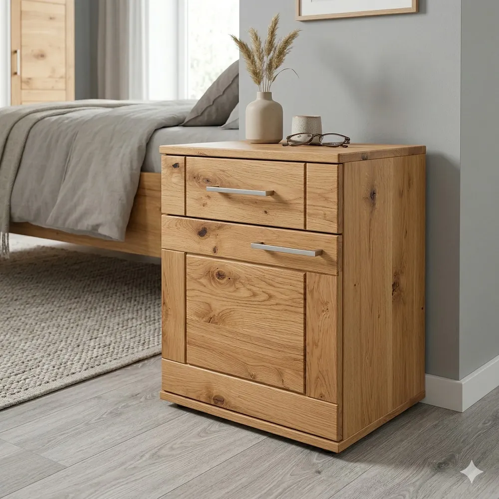 Dubový nočný stolík spája poctivé remeslo, prirodzenú kresbu masívneho dreva a praktické úložné riešenie pri posteli. Zásuvka ukryje drobnosti na každý večer, dvierka ponúknu priestor na všetko, čo má zostať mimo pohľadu. Výsledkom je pokojný detail spálne, ktorý dozrieva spolu s domovom. Nočný stolík z dubu vzniká z masívneho dreva s mierne rustikálnym charakterom. Pri dotyku cítiť pevnosť dubu aj príjemnú hebkosť, ktorú prináša povrchová úprava. Každá hrana prechádza starostlivým opracovaním, aby drevený nočný stolík pôsobil mäkko na pohľad aj na dotyk. Ručné spracovanie necháva vyniknúť charakter masívu bez zbytočného zakrývania materiálu. Práve v tom spočíva hodnota, ktorú rodiny hľadajú pri výbere nábytku na celý život: pevná konštrukcia, opraviteľnosť, nadčasové proporcie a povrch, ktorý starne s eleganciou.