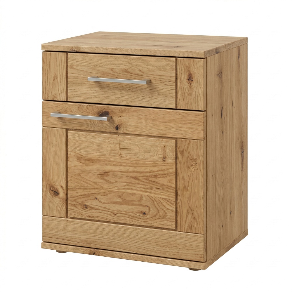 Rozmer nočného stolíka ponúka kompaktné riešenie vedľa postele bez kompromisu v úložnom priestore. Nočný stolík so zásuvkou poslúži na knihu, okuliare, nabíjačku či drobnosti dennej potreby. Spodný priestor za dvierkami pomáha udržať poriadok a zároveň zachovať čistú líniu interiéru. Ako nočný stolík z masívu poskytuje stabilitu a dlhoročnú odolnosť pri každodennom používaní. Dubový nočný stolík je prirodzenou voľbou do interiérov, kde sa kladie dôraz na pravý materiál, dlhú životnosť a remeselnú poctivosť. Povrchová úprava zvýrazňuje hĺbku kresby dreva, chráni povrch pred bežným opotrebením.