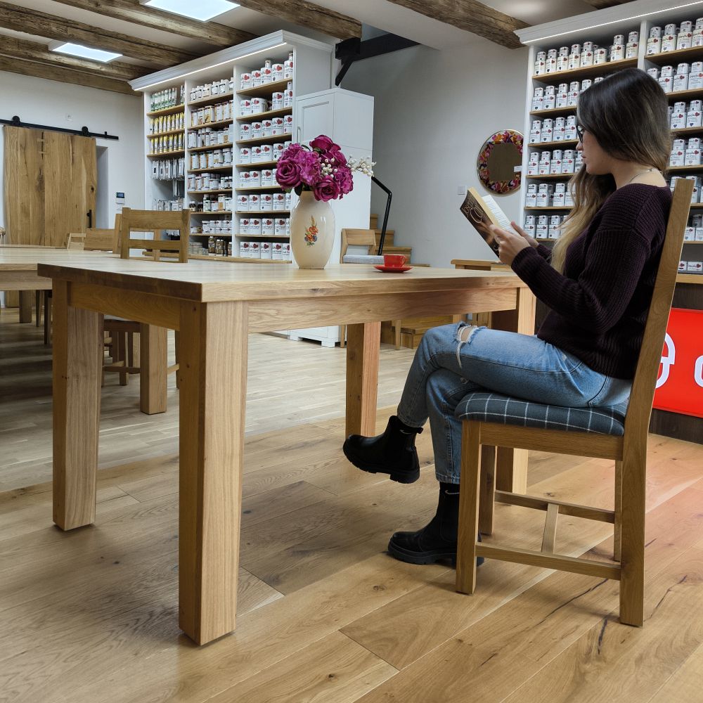 - Masívne dubové drevo použitá pri výrobe jedálenskej stoličky – pevná a odolná konštrukcia