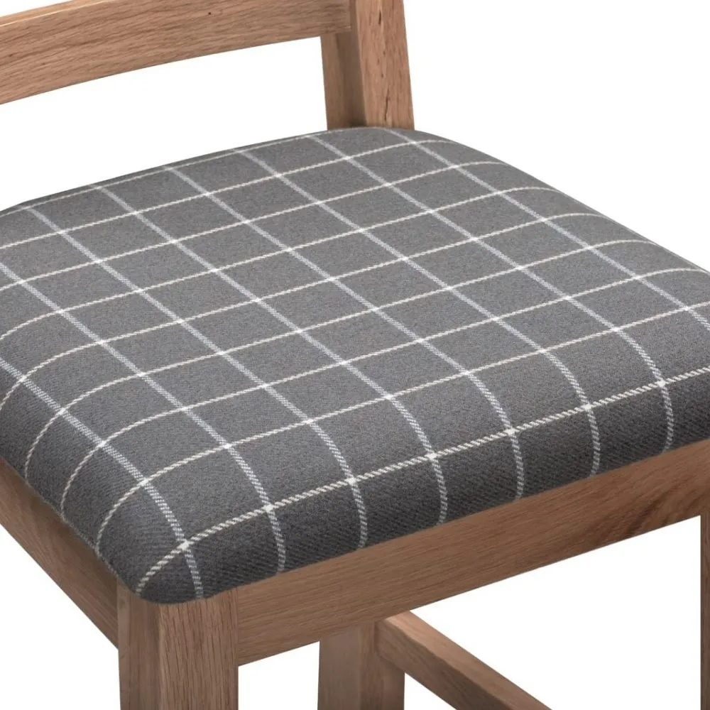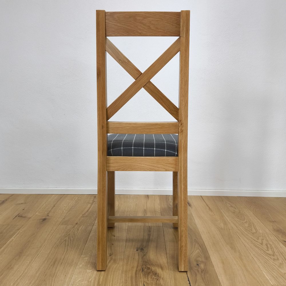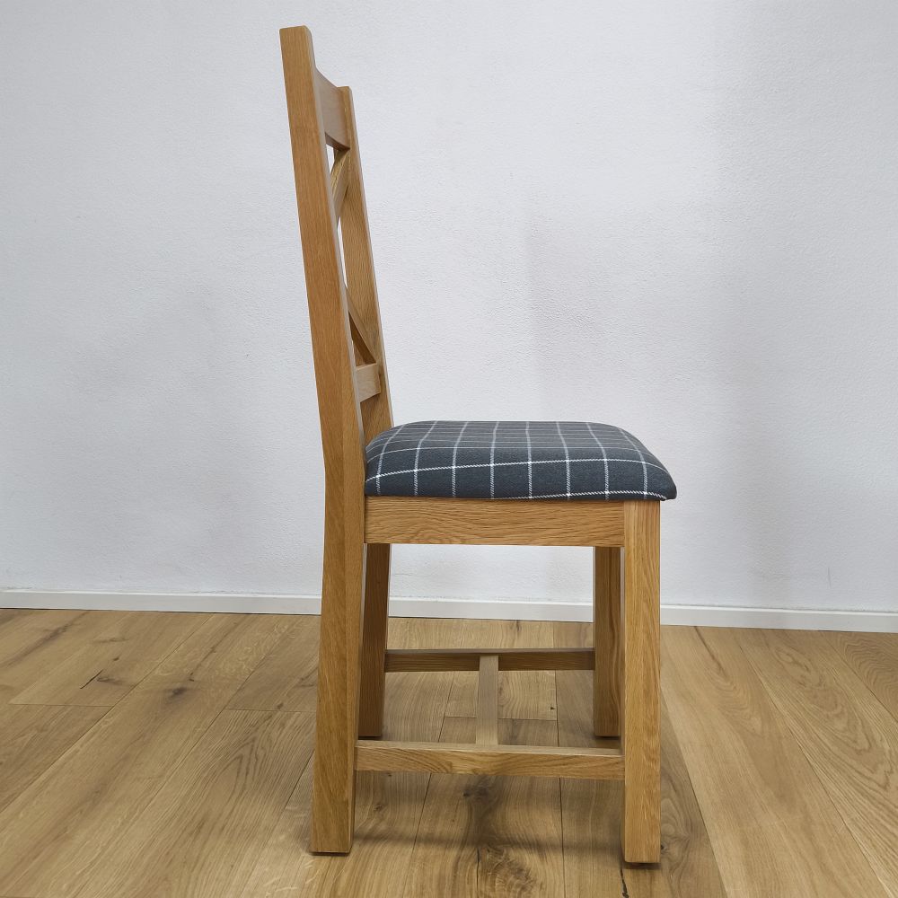 Drevená jedálenská stolička zaujme nielen svojím spracovaním, ale aj komfortom pri sedení. Sedák je čalúnený kvalitnou látkou v šedej farbe so vzorom jemnej mriežky, ktorá je decentná a ľahko kombinovateľná s inými farbami interiéru. Látkový poťah je príjemný na dotyk, priedušný a odolný voči opotrebeniu. Čalúnenie poskytuje mäkké, pohodlné sedenie, ktoré oceníte nielen pri rýchlych raňajkách, ale aj počas dlhších rodinných večerí či sviatočných posedení.