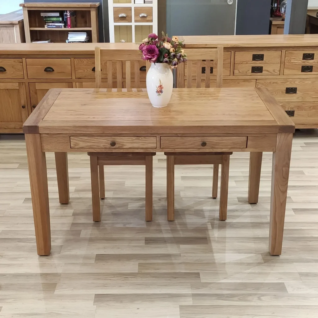 Klasický jedálenský pevný stôl so zásuvkami ako ho poznajú naše staré matere. Stôl vyrobený z pevného dubového dreva, obohatený o dôvtipné zásuvky pod hlavnou doskou ocení každý milovník rustikálnej účelnosti.