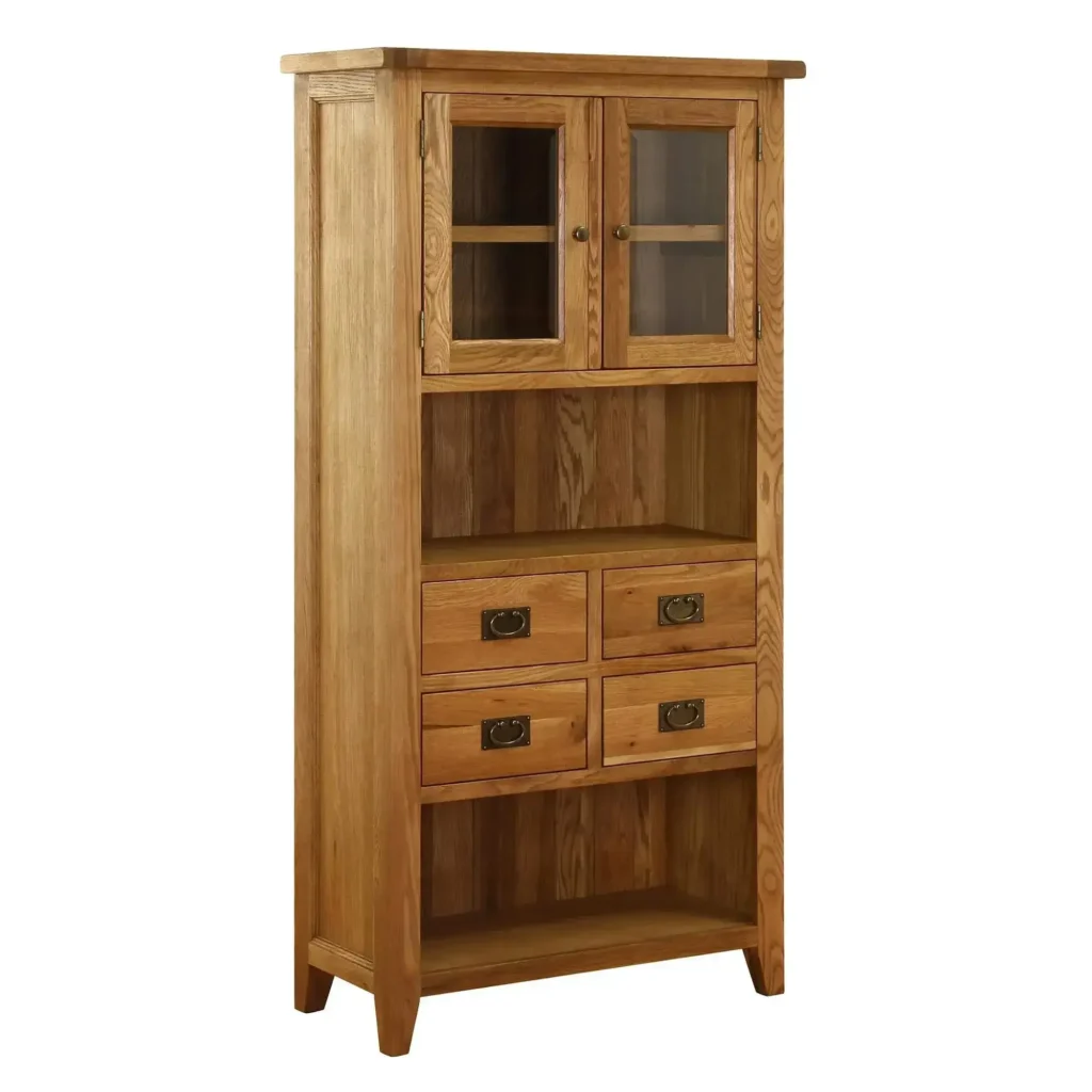 Ojedinelá dubová knihovnička s vitrínou a 4 zásuvkami, poskytuje dostatok úložného priestoru pre knihy a iné drobné predmety. Viacúčelový nábytok je nadizajnovaný tak, aby plnil naraz funkciu knižnice, príborníka či zásuvkovej skrine. Takto šetrí priestor a zároveň je veľmi netradičným a inovatívnym nábytkom, ktorý sa môže časom využívať rôznymi spôsobmi v rozdielnych miestnostiach interiéru.