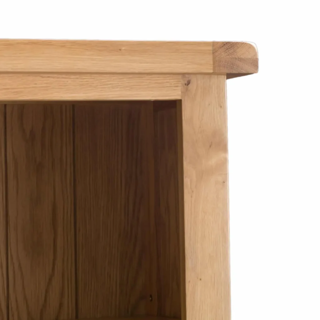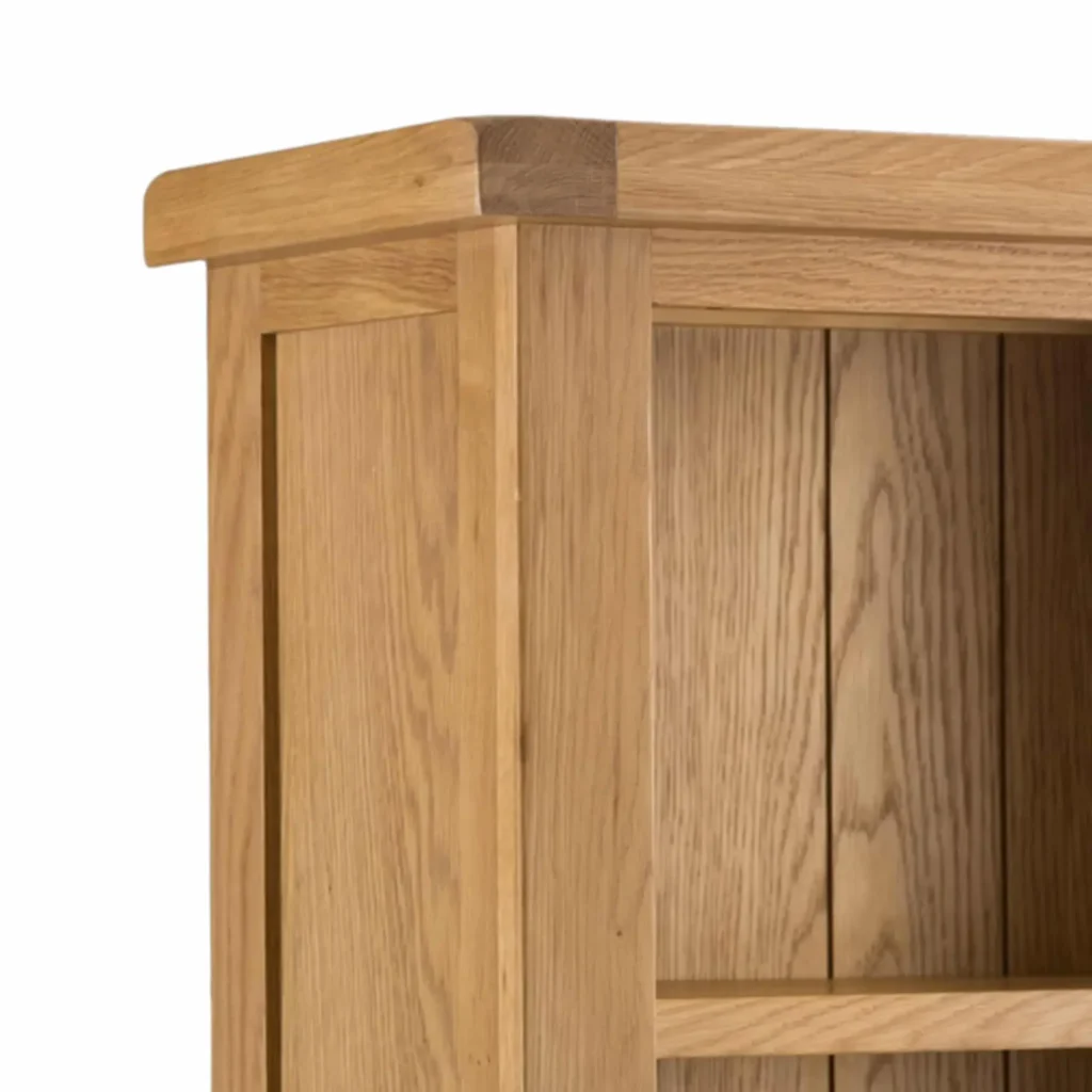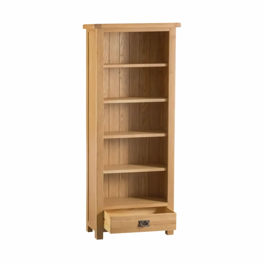 Tento regál je vyrobený z kvalitného masívneho dubového dreva, ktoré je známe svojou pevnosťou a odolnosťou. Zadná strana knižnice je taktiež z masívneho dubu, čo zabezpečuje celkovú stabilitu. Zásuvka je vyrobená z borovicového dreva, pričom jej vnútorná konštrukcia je spracovaná s dôrazom na detail.