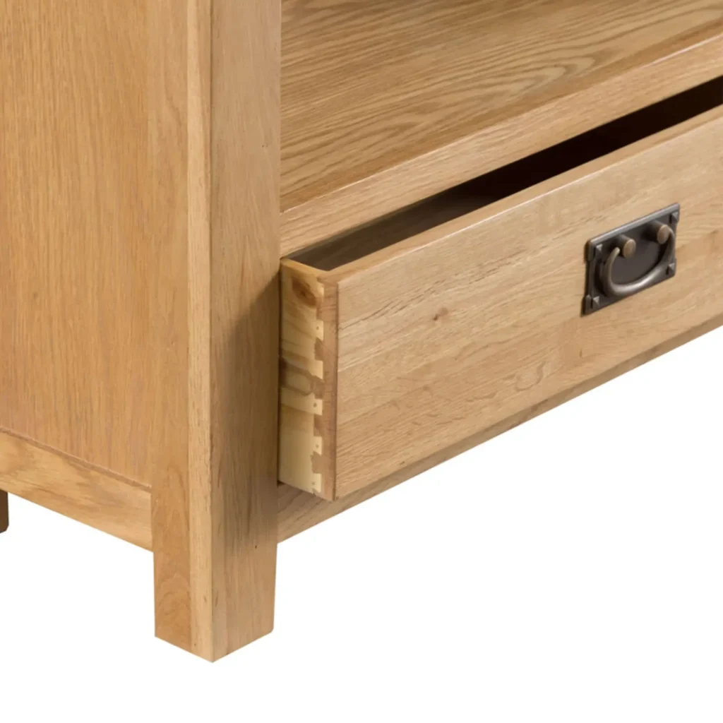 Okrem priestranných políc ponúka táto dubová knižnica aj zásuvku v spodnej časti, ktorá je ideálna na uloženie dokumentov, kancelárskych potrieb či iných drobností. Klasická drevená zásuvka je vedená na drevených lištách a vďaka rybinovému spoju je mimoriadne pevná a stabilná.