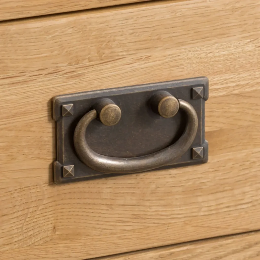 Zásuvka je vybavená kovovou úchytkou s mosadzným efektom, ktorá dodáva knižnici vintage vzhľad a eleganciu. Tento detail podčiarkuje celkový dizajn nábytku a zabezpečuje pohodlné otváranie a zatváranie zásuvky.