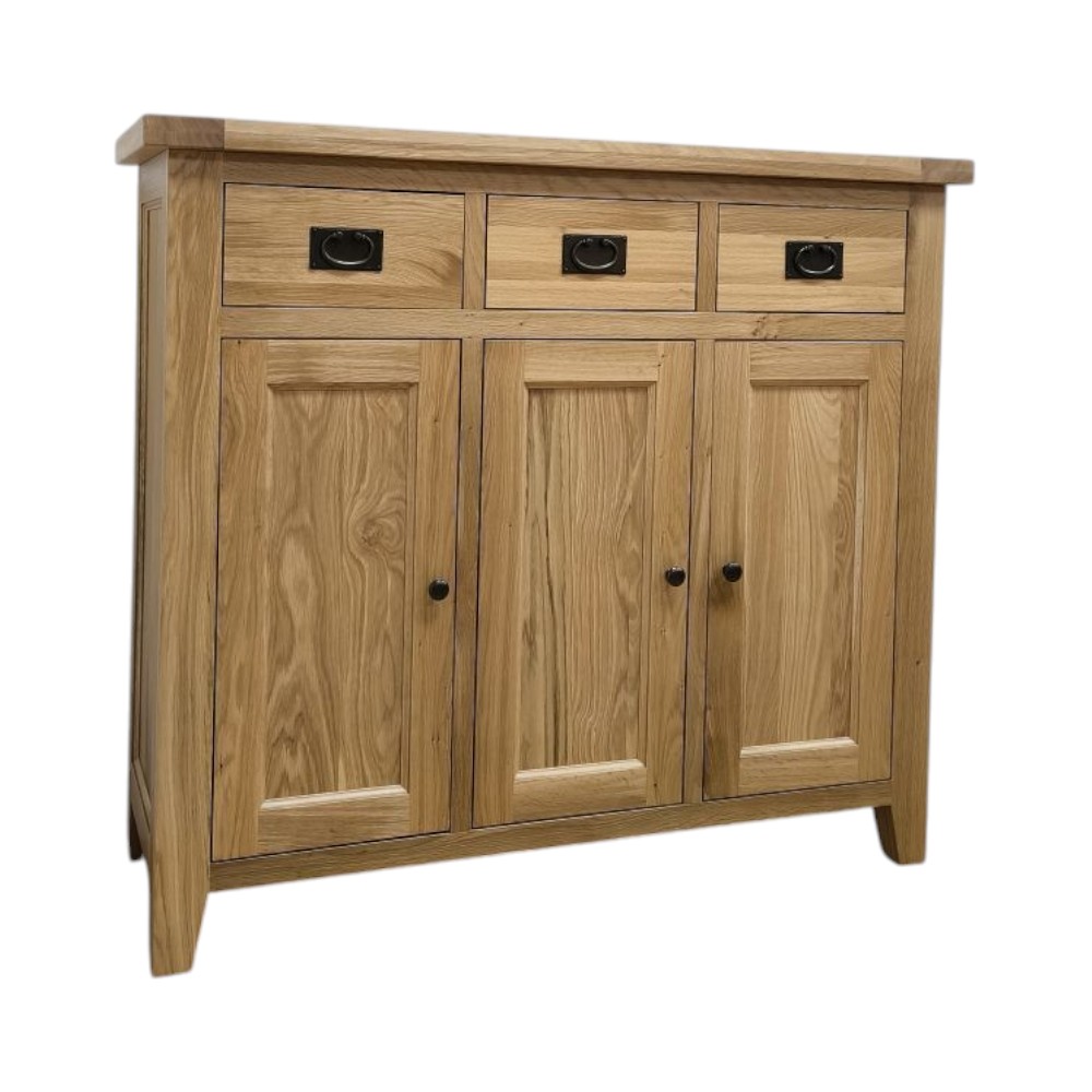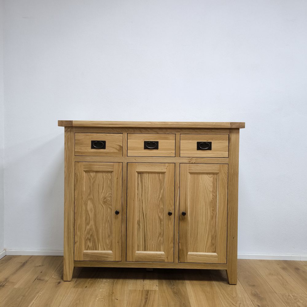 Drevená komoda je praktickým riešením pre domácnosti, ktoré hľadajú funkčný nábytok z masívu s dostatkom úložného priestoru. Horná časť obsahuje tri zásuvky, ideálne na drobnosti, dokumenty či osobné predmety. Spodná časť disponuje trojicou dvierok, za ktorými sa nachádzajú police navrhnuté tak, aby bolo možné bez problémov uložiť šanóny na dokumenty. Komoda so zásuvkami a dvierkami spája praktické riešenie s pevnou konštrukciou z prírodného dreva.