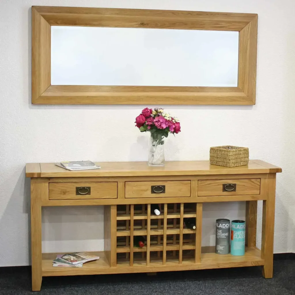 Komoda na víno s rozmermi 180 x 45 x 83 cm je výrazným prvkom interiéru, ktorý v sebe spája estetiku, funkčnosť a remeselnú poctivosť. Vďaka svojmu dizajnu z masívneho dreva zapadne rovnako dobre do moderného, ako aj do rustikálneho či vintage prostredia. Ide o nadčasový kus nábytku z masívu, ktorý nezostarne ani po rokoch používania. Vizuálne príťažlivý povrch v teplom dubovom odtieni vytvára harmonickú atmosféru domova, ktorá podčiarkuje útulnosť miestnosti. Prírodný vzhľad dopĺňajú kovové úchytky vo vintage štýle, ktoré dodávajú celej komode charakter a eleganciu.