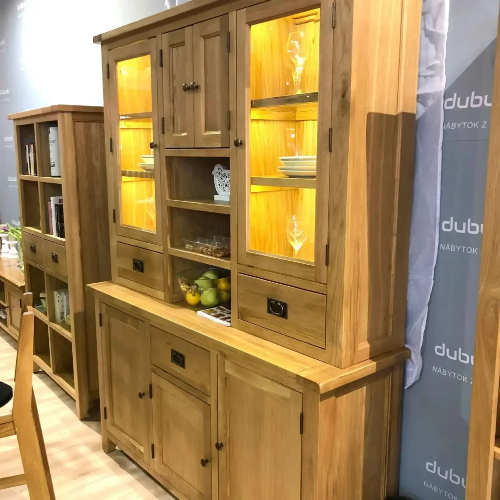 Zostava masívnej komody s vitrínou je krásnym kúskom nábytku hodiacim sa do moderných priestorov, ale aj priestorov zariadených vo vidieckom či vintage štýle. Zostava má šírku 150 cm. Masívnosť konštrukcie zabezpečuje stabilitu nábytku, a takisto jeho dlhú trvácnosť a krásu, ktorá nepominie ani po niekoľkých generáciách. Povrch nábytku je upravený olejmi, ktoré ho chránia a dodávajú mu potrebný lesk, avšak nábytok je vhodné po nejakej dobe znovu oživiť olejom alebo voskom z našej ponuky.