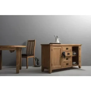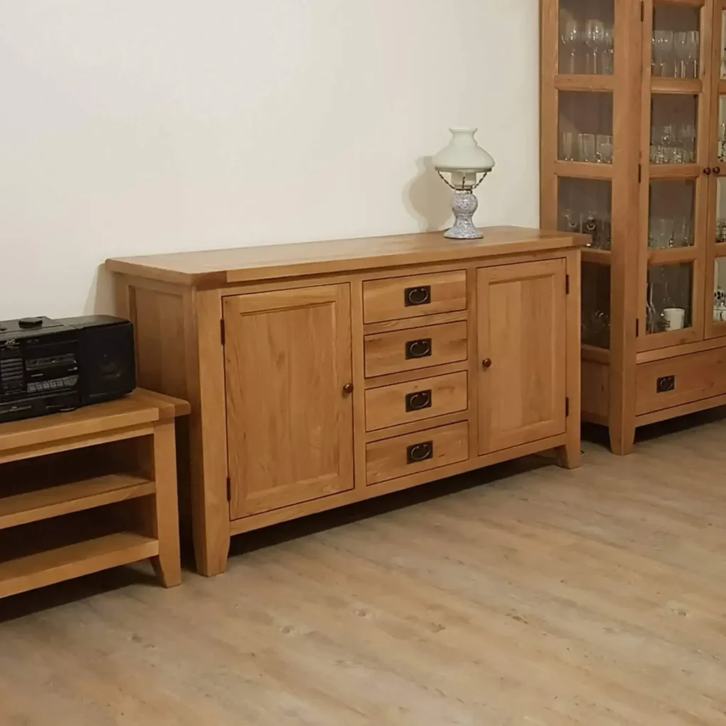 Rozmery 150 x 45 x 85 cm zaručujú dostatok priestoru bez toho, aby komoda pôsobila robustne alebo zaberala priveľa miesta. Stredná časť je vybavená štyrmi zásuvkami (šuflíkmi), ktoré sú ideálne na odkladanie drobností, dokumentov, bielizne alebo iných každodenných potrieb. Na oboch stranách sa nachádzajú dvierka, za ktorými sa ukrýva priestranný úložný priestor s policami, ideálny na väčšie predmety, knihy alebo riad. Táto komoda so šuflíkmi a dvierkami poskytuje praktickosť bez kompromisov. Aj keď ide o tradičný kus nábytku, vďaka čistým líniám a decentným kovovým úchytkám pôsobí táto drevená komoda moderne a nadčasovo. Dokáže tak spojiť rustikálny šarm s elegantným dizajnom, ktorý sa hodí do vidieckych aj súčasných interiérov. Komoda drevená z dubového masívu dokáže v priestore vytvoriť útulnú a prírodnú atmosféru.