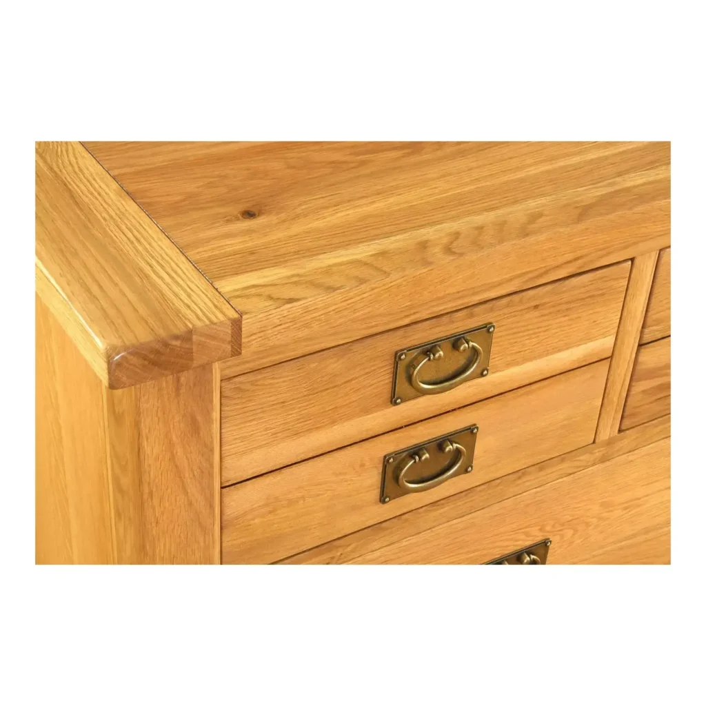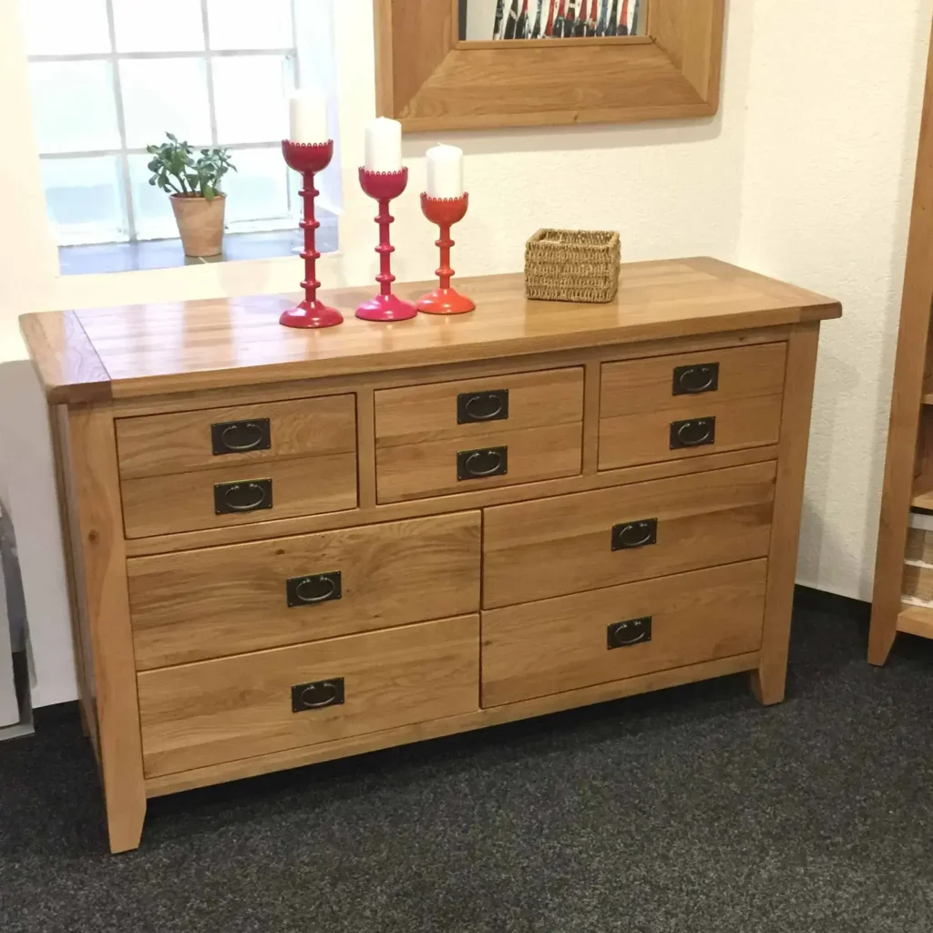 Masívna drevená komoda s rozmermi 150 × 50 × 90 cm ponúka celkovo sedem zásuviek – tri menšie v hornej časti a štyri veľké v spodnej časti. Táto šuflíková komoda tak zabezpečuje prehľadné usporiadanie vecí a efektívne využitie úložného priestoru. Komoda vďaka svojim rozmerom pôsobí dominantne, no zároveň harmonicky zapadne do interiéru.