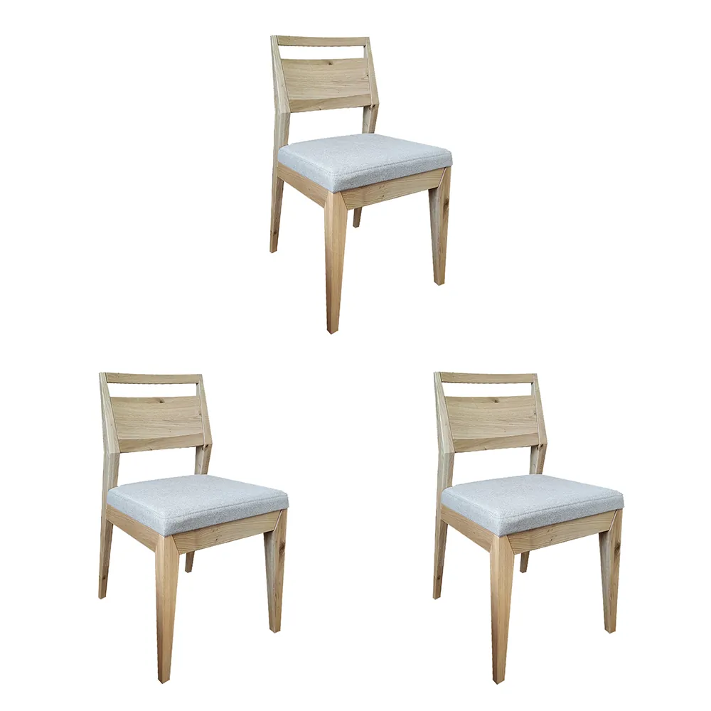 Set 3 kusov pohodlných jedálenských stoličiek z kvalitného dubového masívu s moderným dizajnom. Jedálenské stoličky vybavené micro-vláknovou textilnou látkou, ktorá je odolná voči vode, čím poskytuje komfort pri každodennom používaní. Masívna drevená konštrukcia stoličiek zaručuje stabilitu a dlhú životnosť. Nohy s trecími podložkami chránia podlahu a uľahčujú manipuláciu. Transparentná povrchová úprava zvýrazňuje prirodzenú kresbu dubového dreva a chráni ho pred opotrebením.