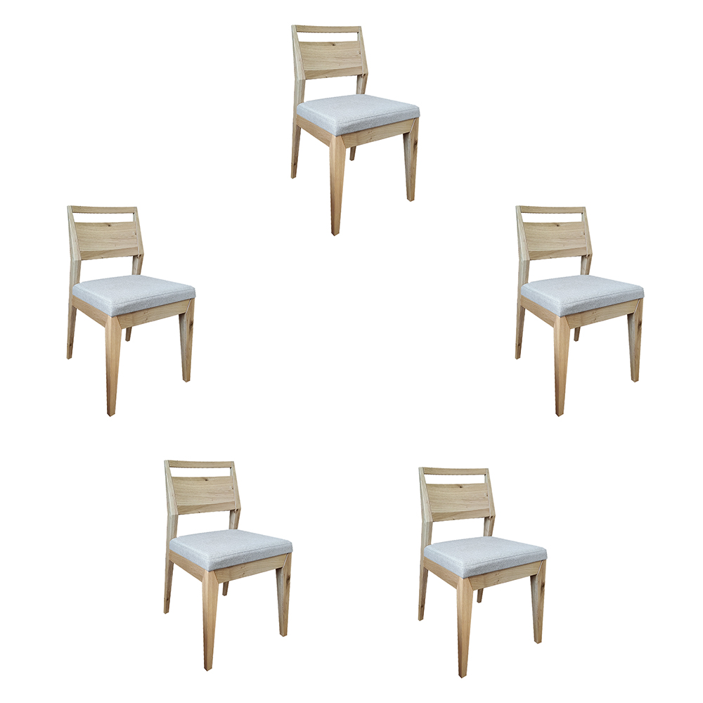 Set 5 kusov pohodlných jedálenských stoličiek z kvalitného dubového masívu s moderným dizajnom. Jedálenské stoličky vybavené micro-vláknovou textilnou látkou, ktorá je odolná voči vode, čím poskytuje komfort pri každodennom používaní. Masívna drevená konštrukcia stoličiek zaručuje stabilitu a dlhú životnosť. Nohy s trecími podložkami chránia podlahu a uľahčujú manipuláciu. Transparentná povrchová úprava zvýrazňuje prirodzenú kresbu dubového dreva a chráni ho pred opotrebením.