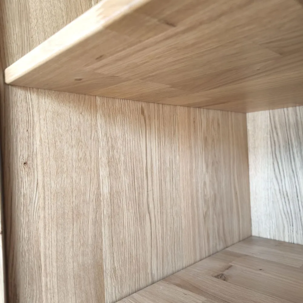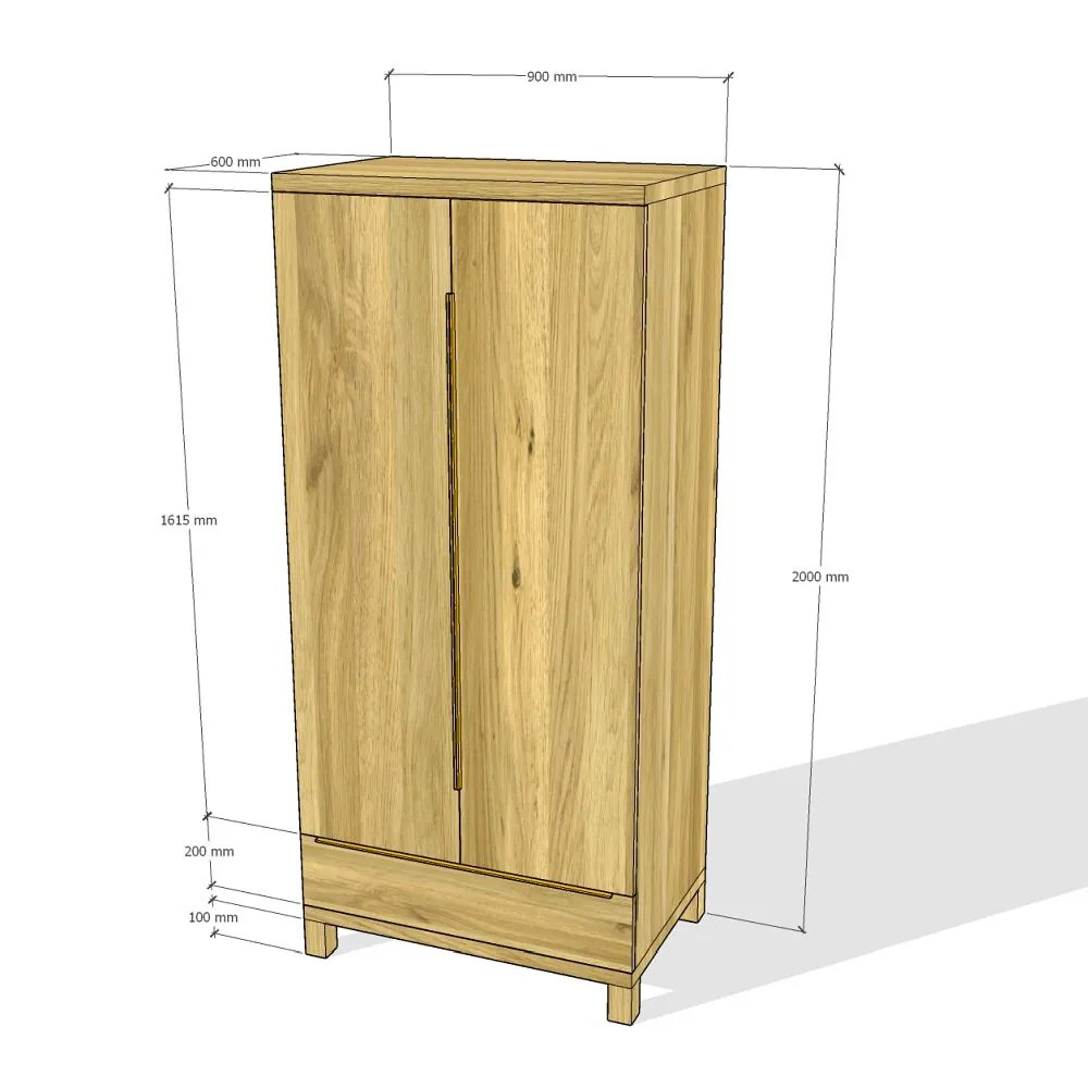 Masívna šatníková skriňa na oblečenie je navrhnutá tak, aby sa prispôsobila rôznym potrebám užívateľov. Vnútorný priestor skrine je vybavený štyrmi policami alebo tyčou na vešanie oblečenia. Úložný priestor skrine dopĺňa kvalitná celo-dubová zásuvka s kovovými úchytkami v jasne zlatej farbe. V prípade potreby je možné usporiadanie vnútorného vybavenia modifikovať na mieru. Skriňa stojí na nožičkách s rozmerom 6×6 cm. V prípade potreby je možné nožičky demontovať a skriňu umiestniť na 4 cm podstavec – ideálne riešenie pre minimalistické interiéry.