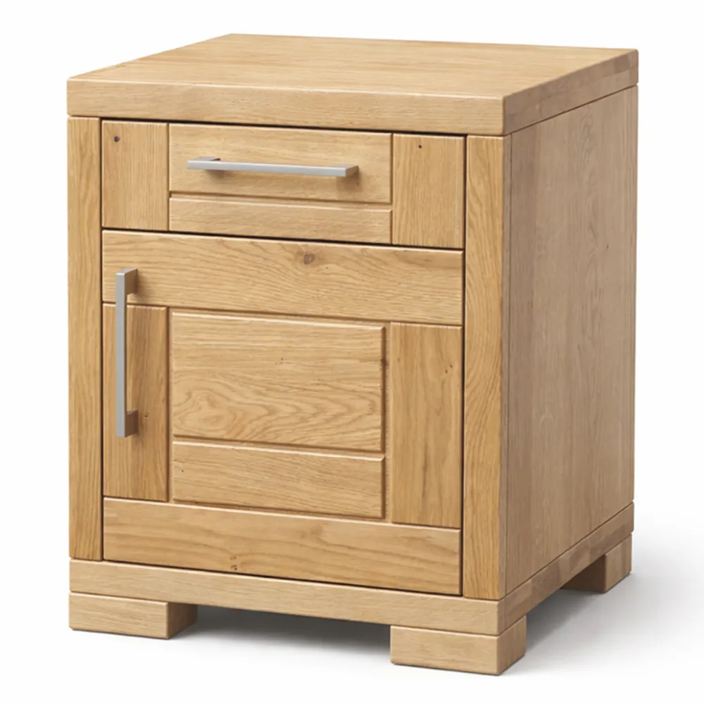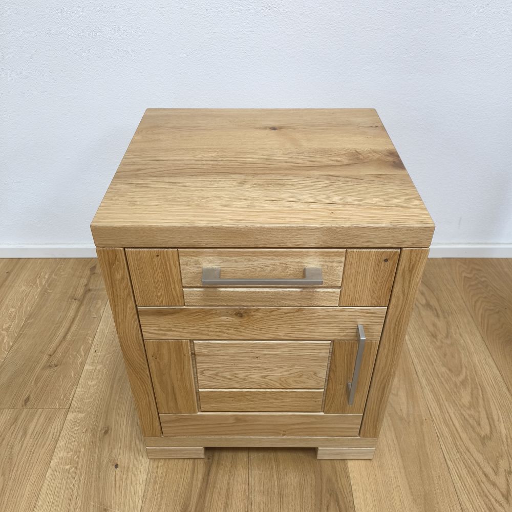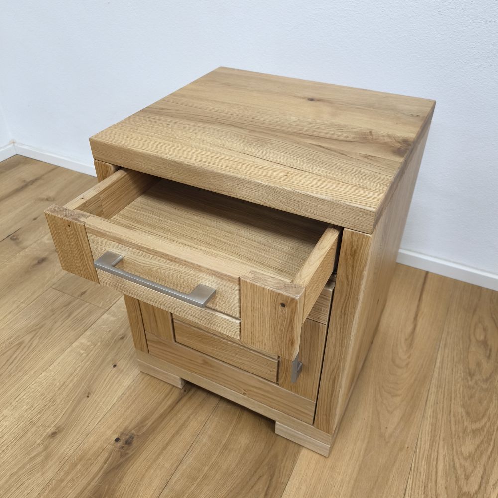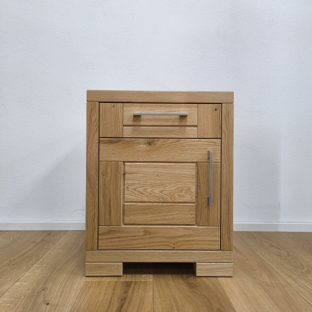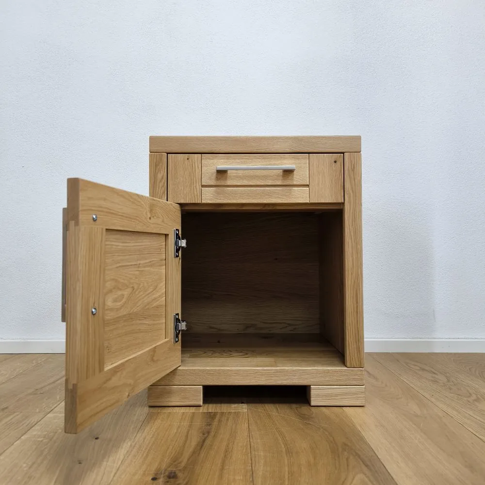 Nočný stolík je nenahraditeľnou súčasťou každej spálne. Tento nízky dubový nočný stolík so zásuvkou a rozmermi 43,8 x 40 x 55 cm vyniká svojím nadčasovým dizajnom a kvalitou spracovania. Vyrobený je z masívneho dubového dreva, ktoré zaručuje dlhú životnosť a odolnosť. Hoci je tento kus nábytku navrhnutý primárne ako nočný stolík do spálne, jeho univerzálne prevedenie umožňuje využitie aj v iných častiach domácnosti. Výborne sa hodí ako podstavec pod lampu alebo ako malý stolík vedľa pohovky. Rovnako dobre poslúži aj v predsieni či detskej izbe ako malý úložný priestor pre drobnosti.