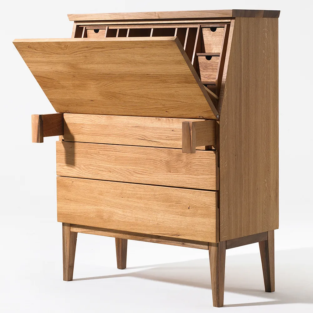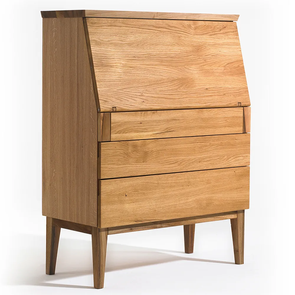 Písacia skrinka má vnútorné usporiadanie navrhnuté tak, aby poskytovala dostatok priestoru pre dokumenty, kancelárske pomôcky alebo osobné drobnosti. Malé zásuvky a priehradky umožňujú prehľadné uskladnenie a jednoduchú organizáciu. Pri zatvorení výklopnej dosky pôsobí sekretár z masívu ako komoda, pri otvorení sa mení na plnohodnotné pracovné miesto.