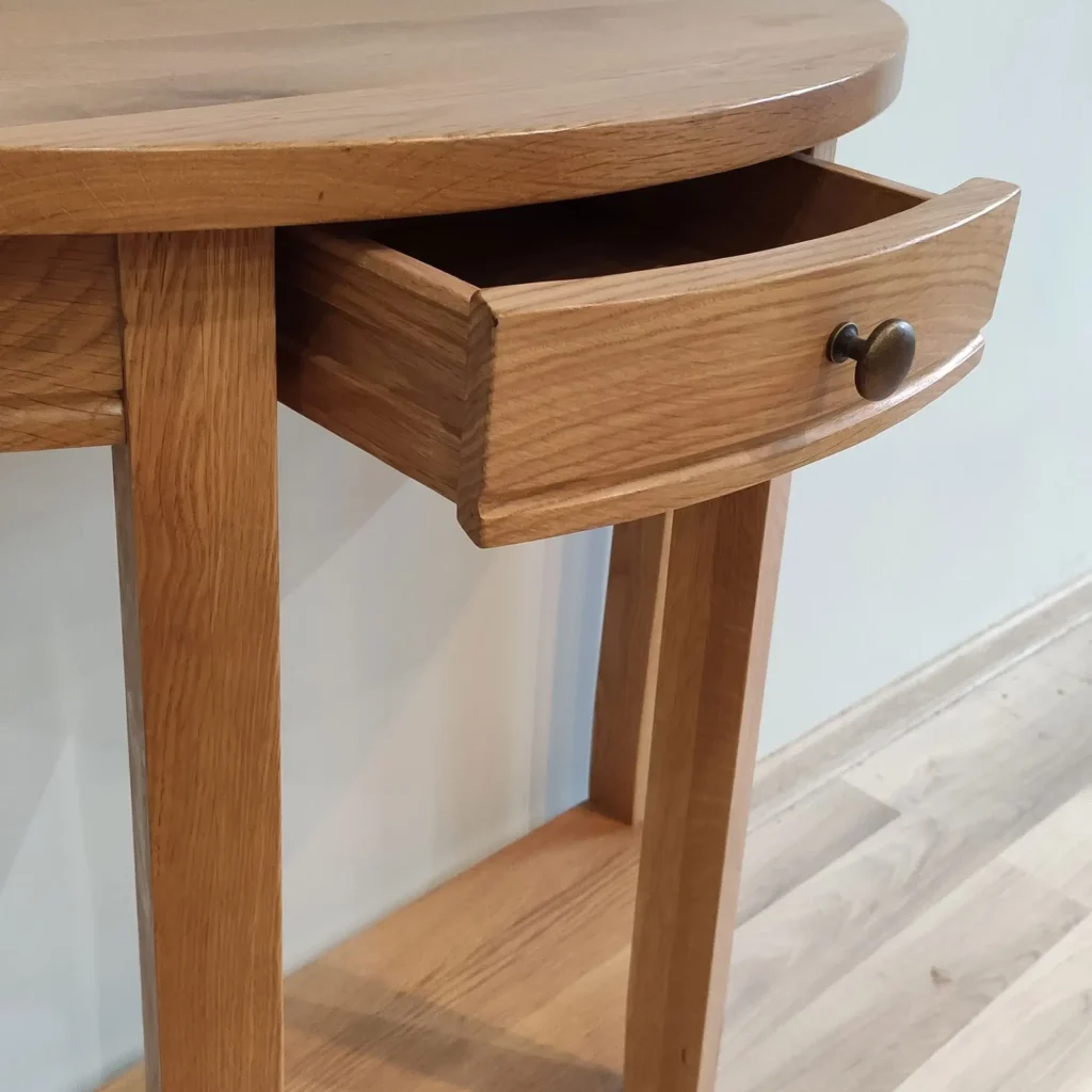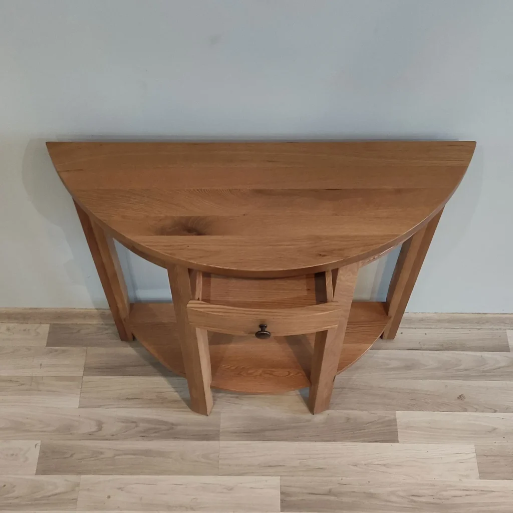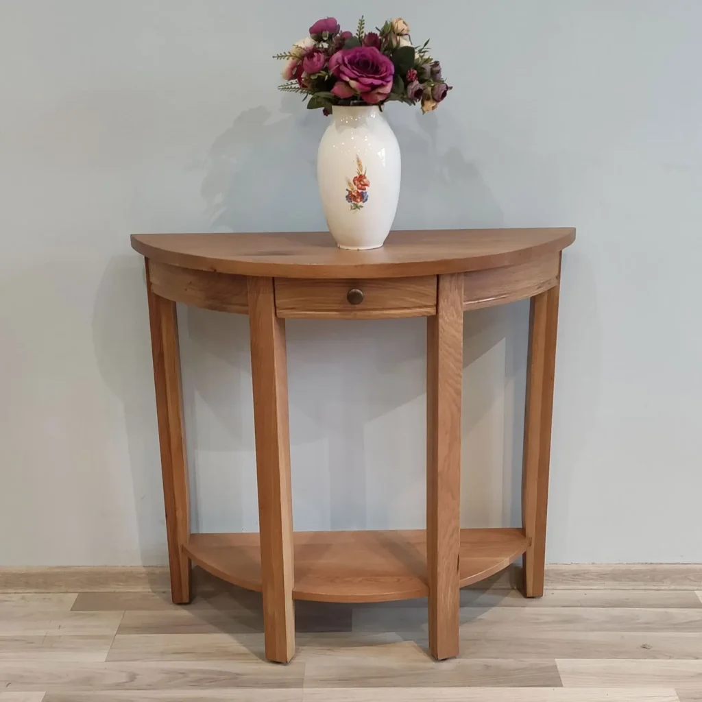 Oválny konzolový stolík z masívu je elegantným doplnkom do predsiene, obývačky i spálne. Praktický drevený pultový stolík na odkladanie zjemní priestory aj v kombinácii so zrkadlom.