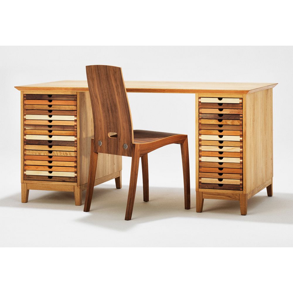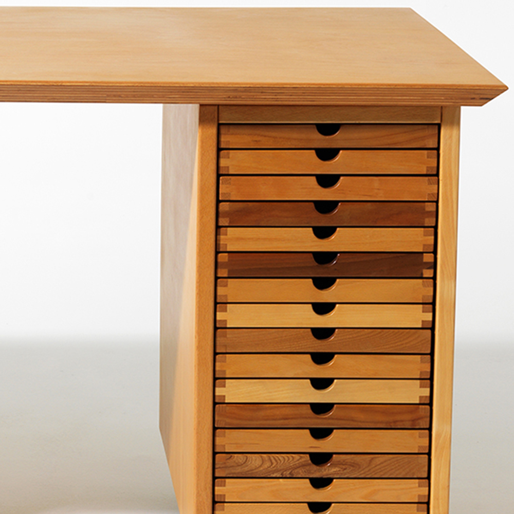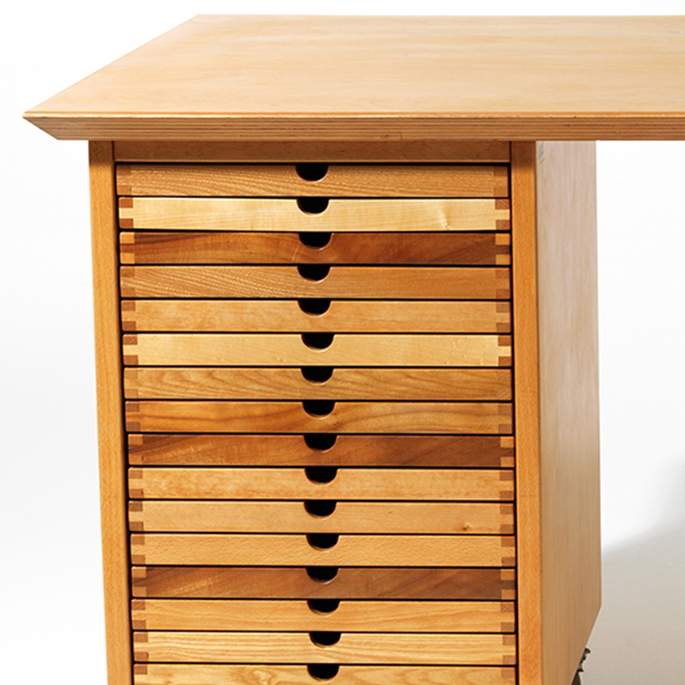 Každé čielko zásuvky odhaľuje jedinečnú kresbu použitého dreva. V rámci jedného stĺpca sa striedajú rozličné odtiene a textúry, ktoré spolu vytvárajú pútavú prírodnú mozaiku. Kontrastné spoje zásuviek nielen umocňujú estetický dojem, ale aj dokazujú precízne remeselné spracovanie a vysokú pridanú hodnotu tohto ručne vyrábaného kusu nábytku.