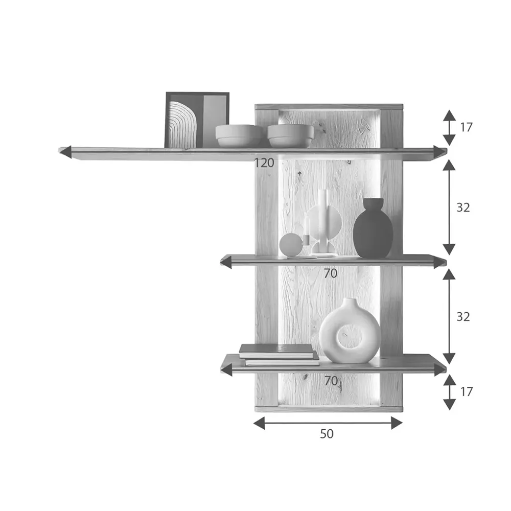 Policová zostava na stenu je ideálna na ukladanie a vystavovanie rôznych dekorácií, kníh alebo iných predmetov, ktoré si zaslúžia byť na očiach. Jej nadčasový dizajn a kvalitné prevedenie z dubového dreva ju robia výnimočným doplnkom, ktorý je vhodný nielen do obývacej izby, ale aj do spálne, kuchyne či predsiene. Dubové drevo, použité na výrobu tejto police, je známe svojou vysokou trvanlivosťou a odolnosťou voči mechanickému poškodeniu, čo zaručuje, že zostava vám bude slúžiť dlhé roky bez viditeľných známok opotrebenia. Prírodná štruktúra dreva s jemnými kresbami a uzlami vytvára jedinečný charakter každej police, pričom dodáva priestoru teplý a útulný vzhľad. Jednou z výrazných vlastností tejto police je možnosť montáže na ľavú alebo pravú stranu, čo zaručuje jej univerzálne využitie a prispôsobenie sa akémukoľvek interiéru. To je výhodné pre tých, ktorí chcú policu prispôsobiť svojim potrebám alebo dispozičnému riešeniu priestoru. Okrem toho je súčasťou police aj LED osvetlenie, ktoré je už zahrnuté v balení. LED podsvietenie dodáva polici jemný svetelný efekt, ktorý zvýrazňuje predmety na nej umiestnené a zároveň vytvára príjemnú atmosféru v miestnosti.