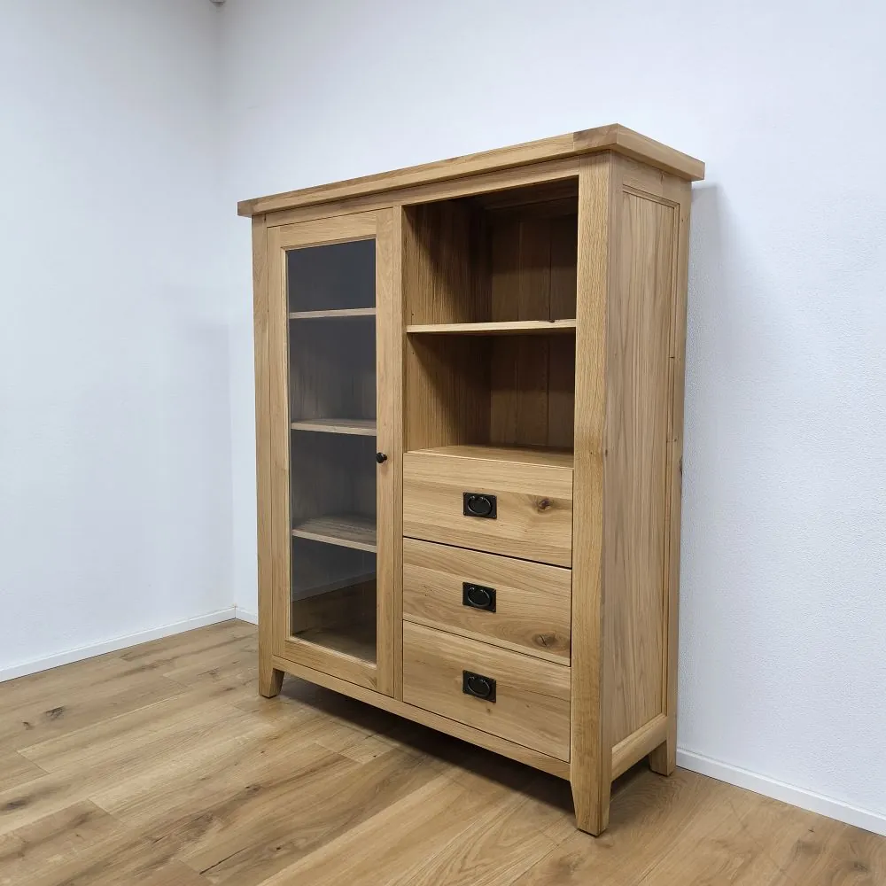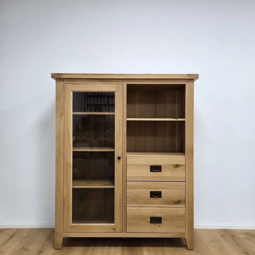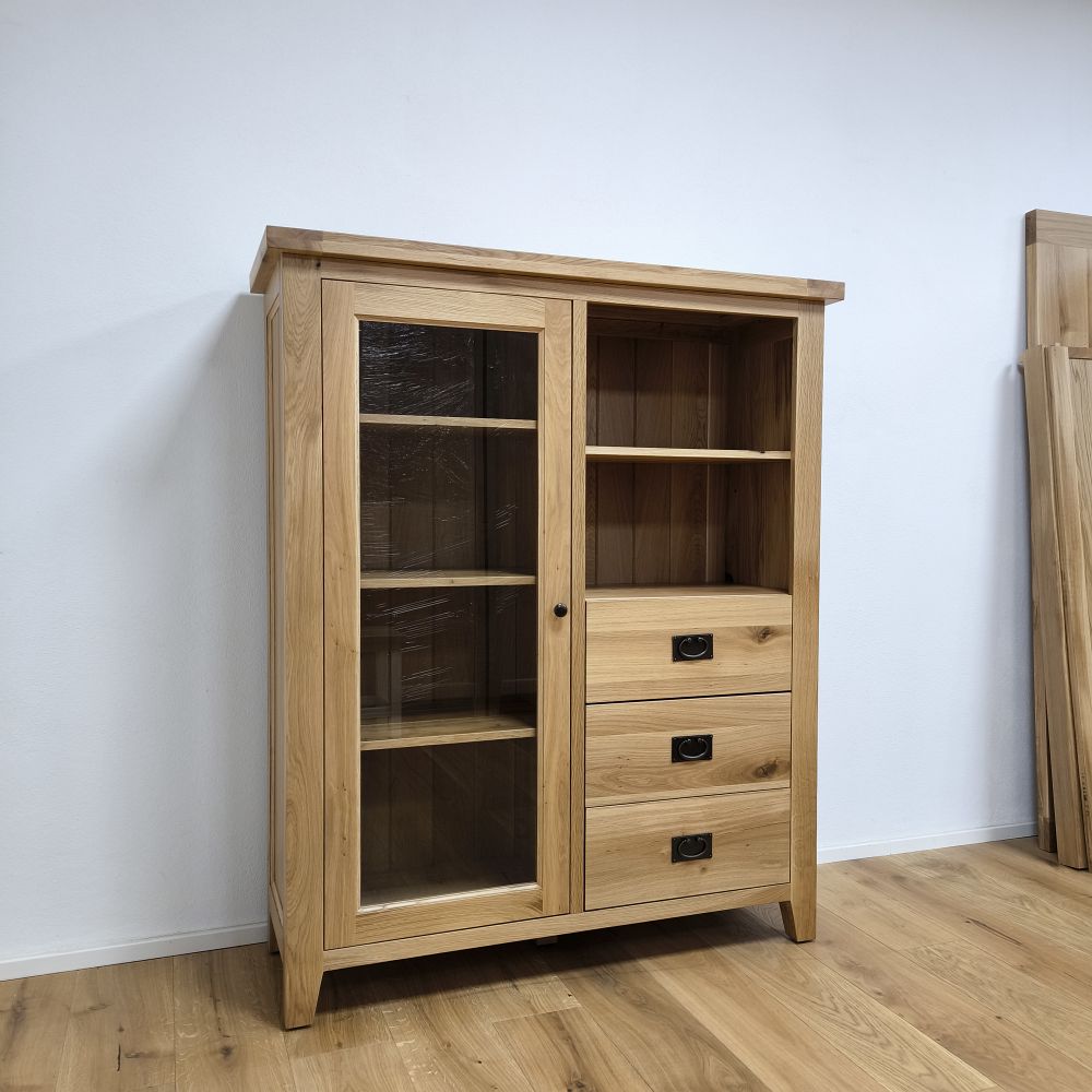 Sekretár je univerzálny kus nábytku, ktorý spája funkčnosť, praktické úložné riešenia a kvalitné spracovanie z masívneho dreva. Na pravej strane sa nachádzajú tri zásuvky, ktoré poskytujú dostatok priestoru na odkladanie dokumentov, textílií alebo osobných predmetov. Nad zásuvkami je otvorená drevená polica, vhodná na rýchly prístup k často používaným veciam. Na ľavej strane sa nachádzajú presklené dvierka so systémom políc, ktoré umožňujú prehľadné uloženie riadu, dekorácií alebo kníh.