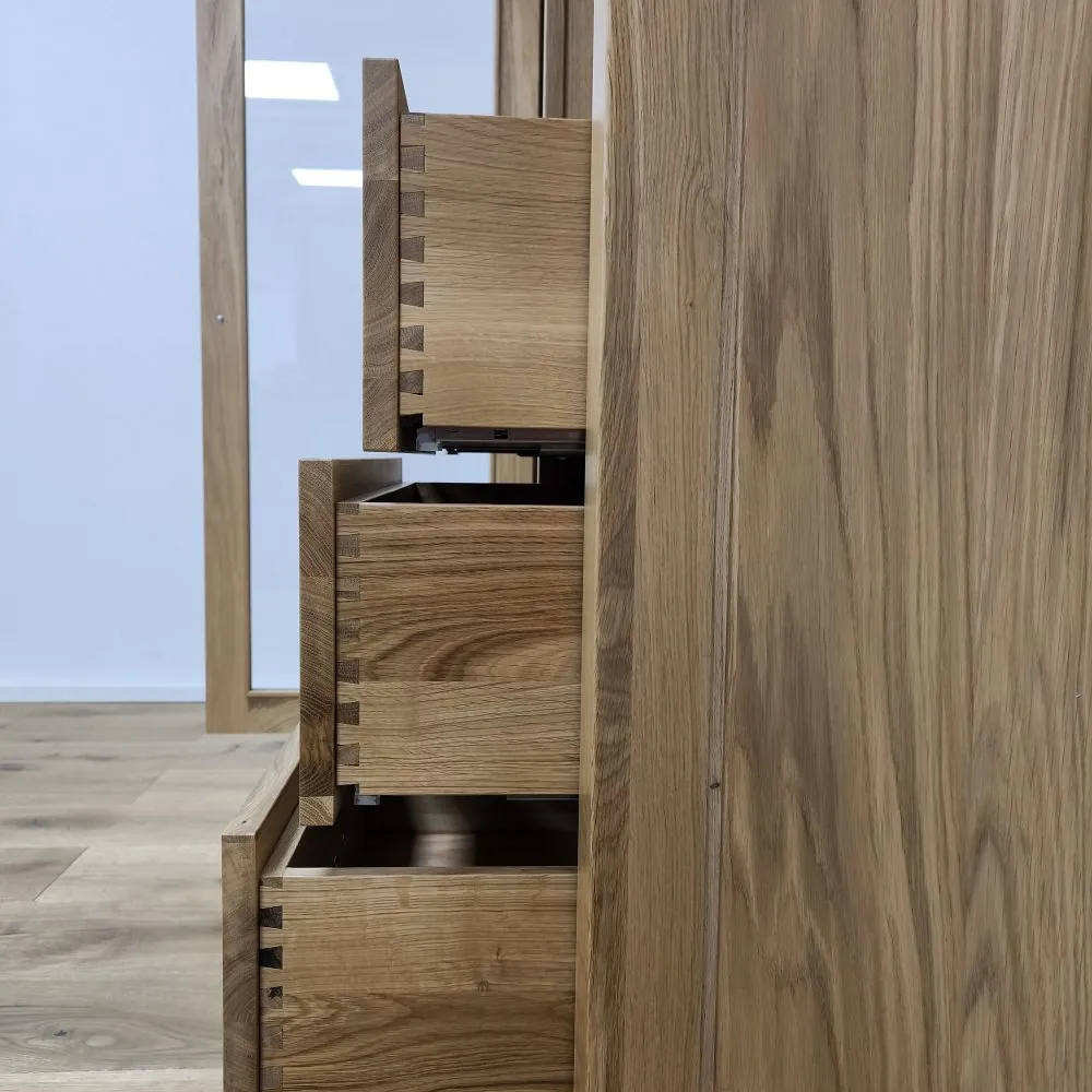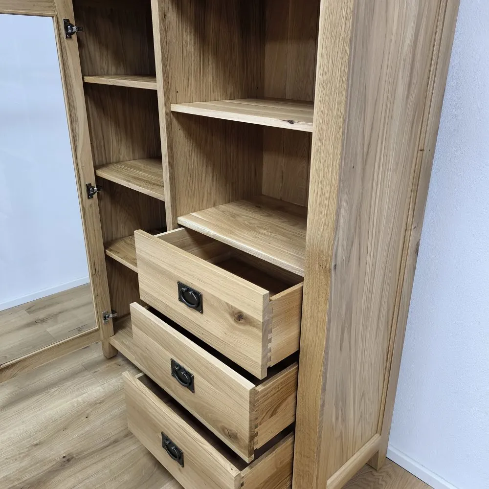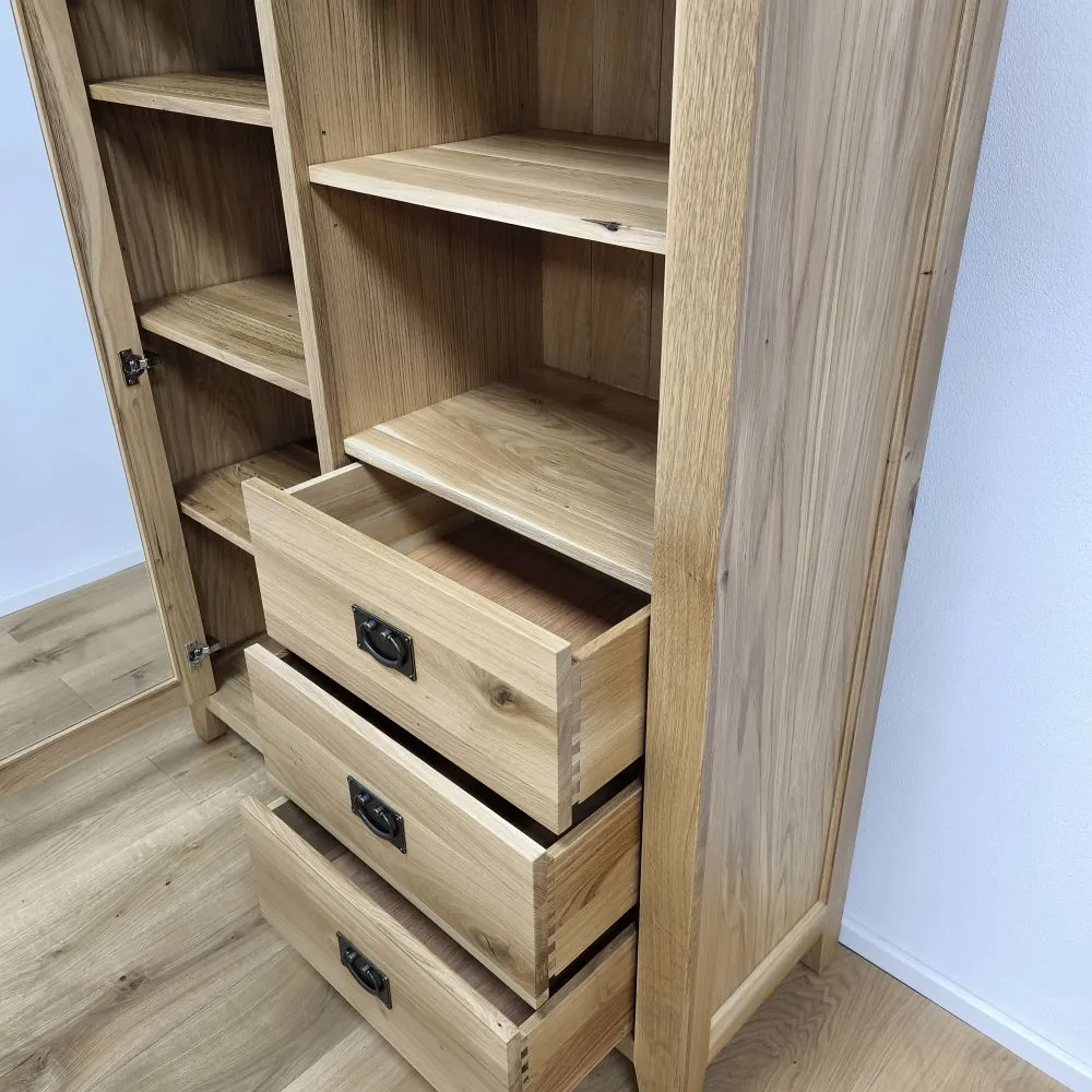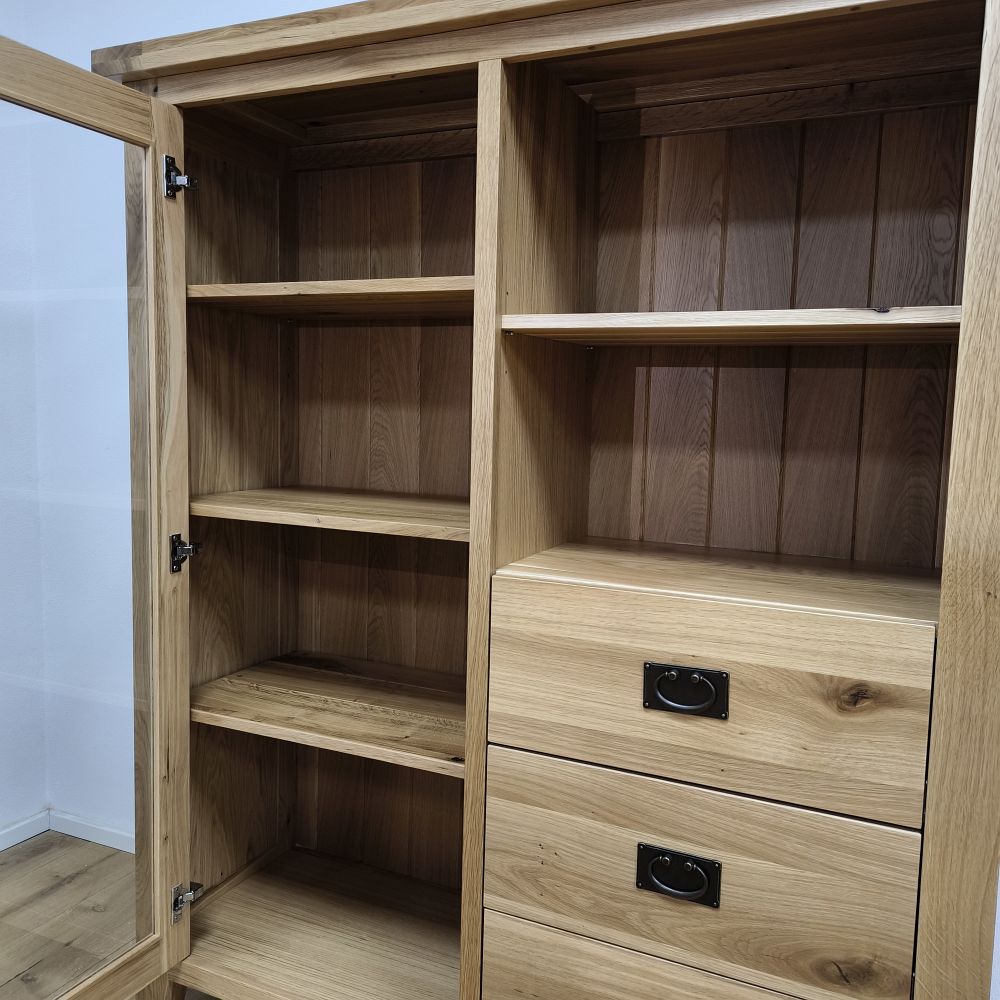 Sekretár je univerzálny kus nábytku, ktorý spája funkčnosť, praktické úložné riešenia a kvalitné spracovanie z masívneho dreva. Na pravej strane sa nachádzajú tri zásuvky, ktoré poskytujú dostatok priestoru na odkladanie dokumentov, textílií alebo osobných predmetov. Nad zásuvkami je otvorená drevená polica, vhodná na rýchly prístup k často používaným veciam. Na ľavej strane sa nachádzajú presklené dvierka so systémom políc, ktoré umožňujú prehľadné uloženie riadu, dekorácií alebo kníh.