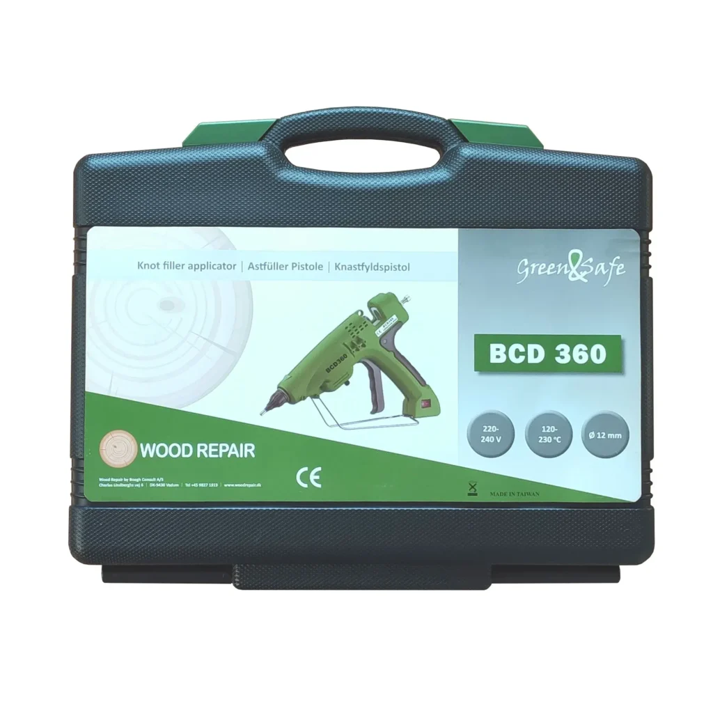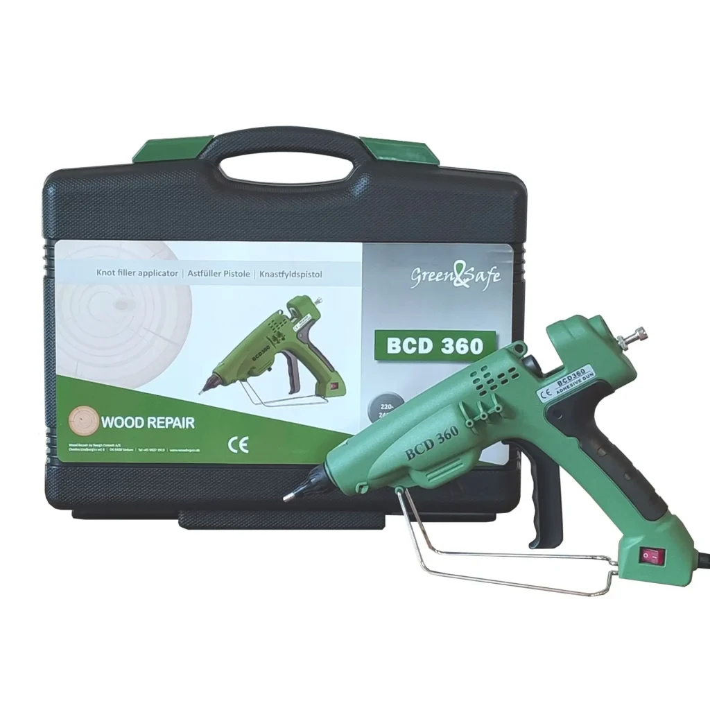 Tavná pištoľ na drevo s výkonom 300W je ideálna pre tmelenie pri vypadnutých hrčiach, oprave hrán či rohu, prípadne pri novovzniknutých prasklinách. Medzi najväčšie výhody profesionálnej tavnej pištole Knot Filler BCD 360 patrí možnosť efektívne nastavovať teplotu tavenia termostatom a upravovať dávkovanie plniva na spúšti.