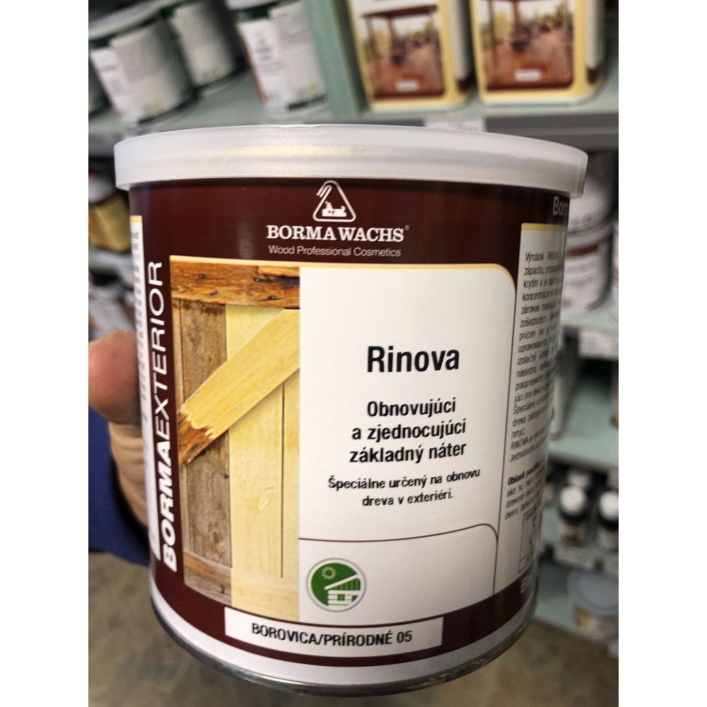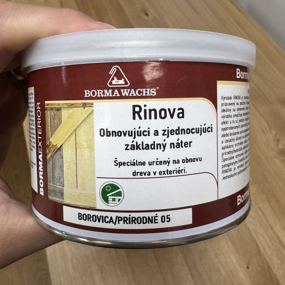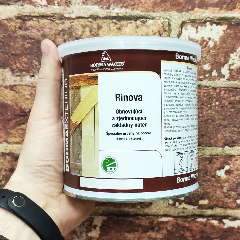 Rinova je ideálnym riešením na renováciu a ochranu dreva najmä vo vonkajšom prostredí – rýchloschnúci, jednoducho aplikovateľný, profesionálna kvalita. Rinova od talianskeho výrobcu Borma Wachs je špeciálne vyvinutý základný náter určený na obnovu a ochranu dreva v exteriéri. Tento bez zápachu, vysoko koncentrovaný prípravok ponúka vynikajúce krytie a zjednocujúci efekt už po jednom nátere – dokonca aj na znečistených, zašlých alebo škvrnitých povrchoch. Vďaka svojim maskujúcim vlastnostiam a izolačnému účinku nie je nutné pred aplikáciou zložité umývanie alebo brúsenie. Rinova výrazne zjednodušuje následné natieranie vrchným náterom. Prípravok môže byť použitý ako polopriehľadný pre dekoratívny vzhľad, alebo ako prekryvný základ, ktorý zjednotí farebný tón starého aj nového dreva. Špeciálne ochranné zložky chránia drevo pred plesňami, hubami a drevokazným hmyzom.