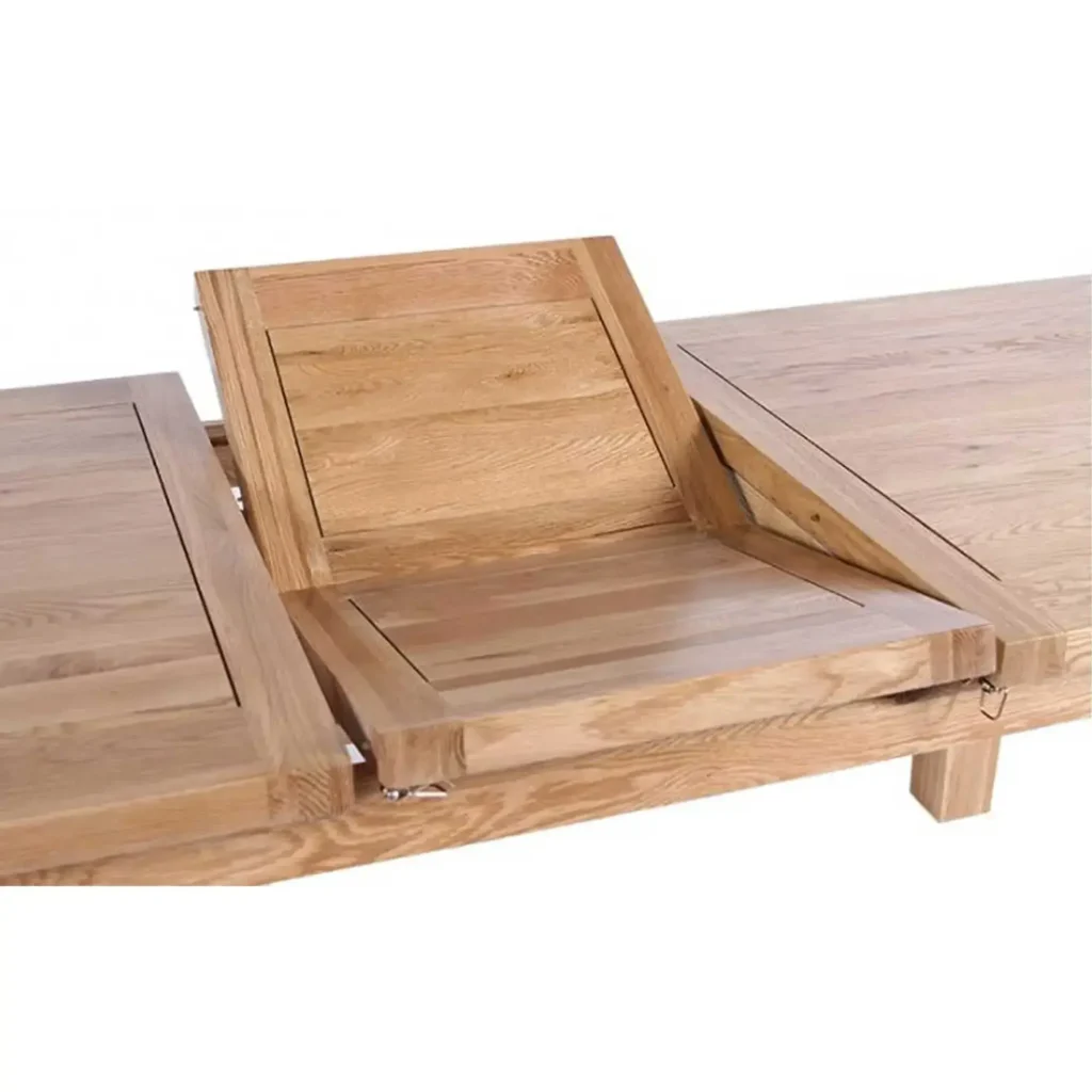 Malý rozkladací okrúhly stôl je postavený na nenáročnom princípe rozkladania. Pod vrchnou doskou je zabudovaný vkladací diel, ktorý je priamou súčasťou stola. Dubová doska, fungujúca na systéme “motýlik”, sa jednoducho vytiahne a vloží medzi odtiahnuté dosky. Stôl má nehybnú spodnú časť a nohy stola pri skladaní stola ostávajú stabilne na mieste.