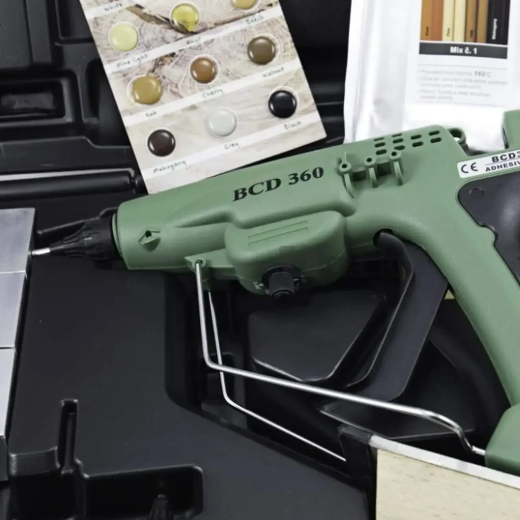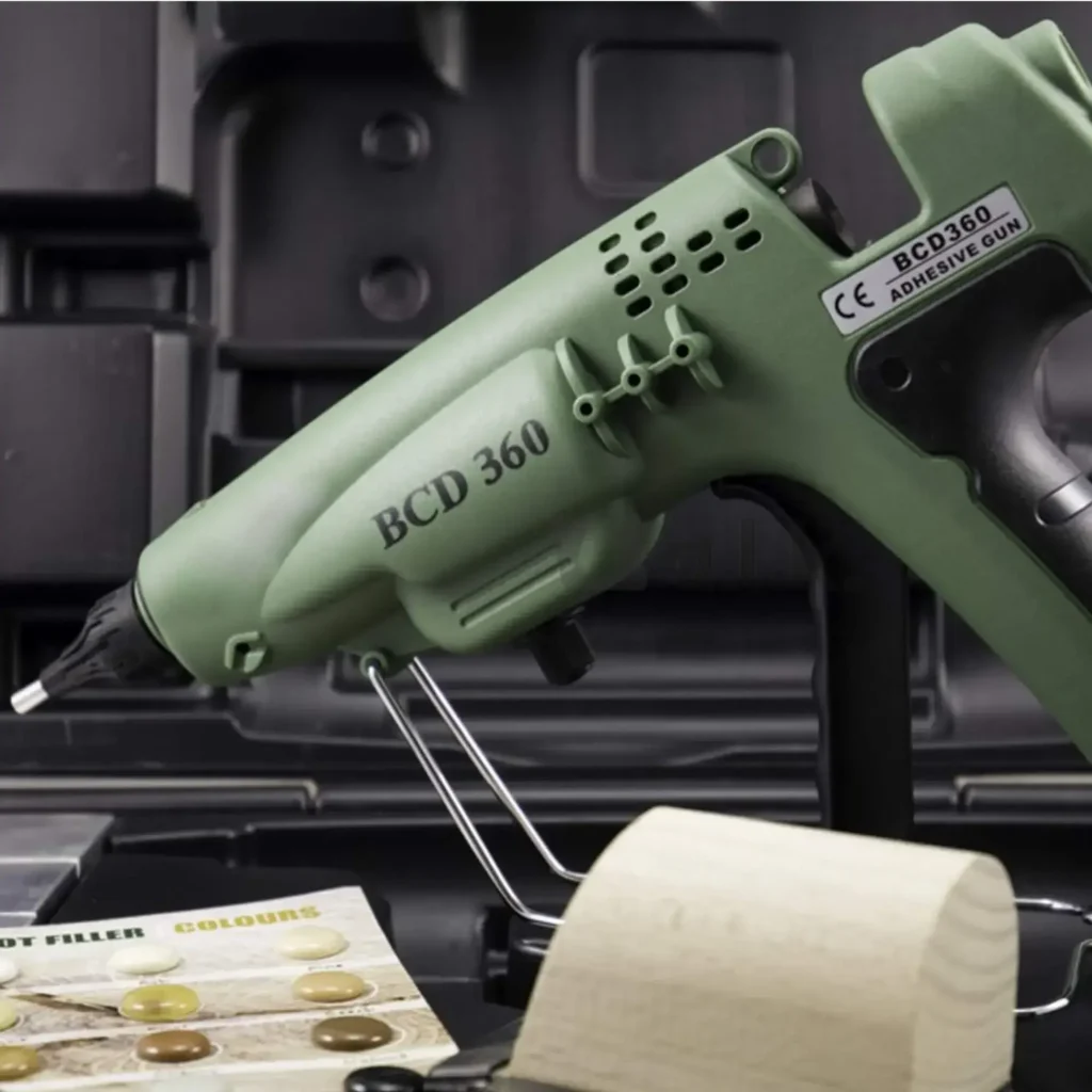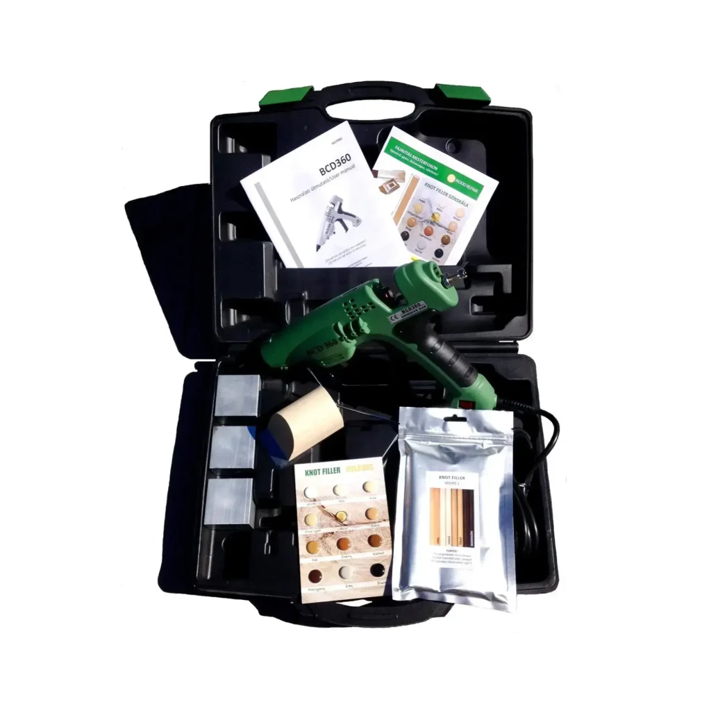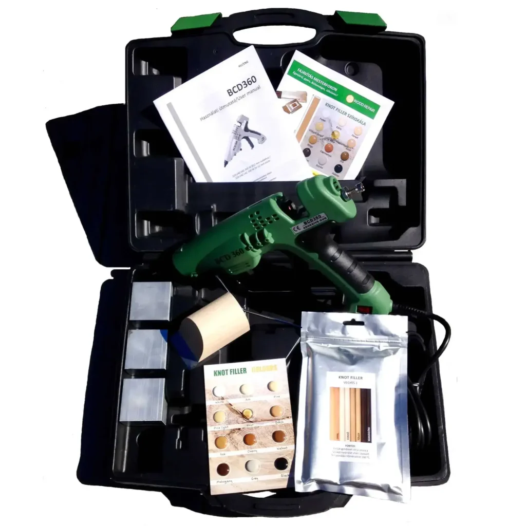 Profesionálna sada Wood Repair Gordius Kit pre opravu tvrdého dreva s profesionálnou, tavnou, pištoľou Knot Filler BCD 360. Profesionálna, tavná, pištoľ s výkonom 300W je ideálne pre tmelenie pri vypadnutých hrčiach, oprave hrán či rohu, prípadne pri novovzniknutých prasklinách. Medzi najväčšie výhody profesionálnej, tavnej, pištole Knot Filler BCD 360 patrí možnosť efektívne nastavovať teplotu tavenia termostatom, upravovať dávkovanie plniva na spúšti a v neposlednom rade možnosť výmeny pigmentu náplní počas práce. Pištoľami Knot Filler dosiahnete ideálnu teplotu na správne tavenie polyamidovej zmesi, ktorá oproti základným pištoliam tyčinky neprevára, polyamid pri tavení nebublinkuje ani neprekvapkáva. Tavná pištoľ, ktorú je možné použivať dlhé roky.