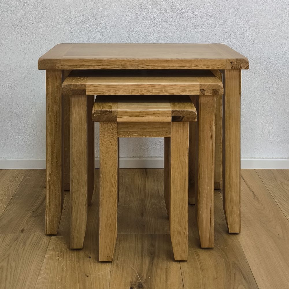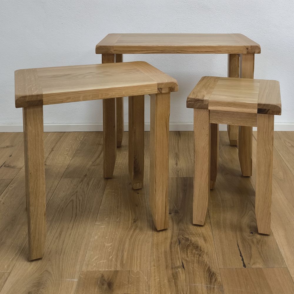 Servírovacie stolíky – set 3 ks sú výnimočnou kombináciou praktickosti, trvácnosti a estetiky. Ideálne ako servírovací stolík, odkladací stolík do obývačky alebo elegantný prístavný stolík do kuchyne. Kvalitné dubové prevedenie vnáša do priestoru pocit prírodného tepla, zatiaľ čo ich variabilita a skladnosť zabezpečia, že nájdu uplatnenie každý deň.