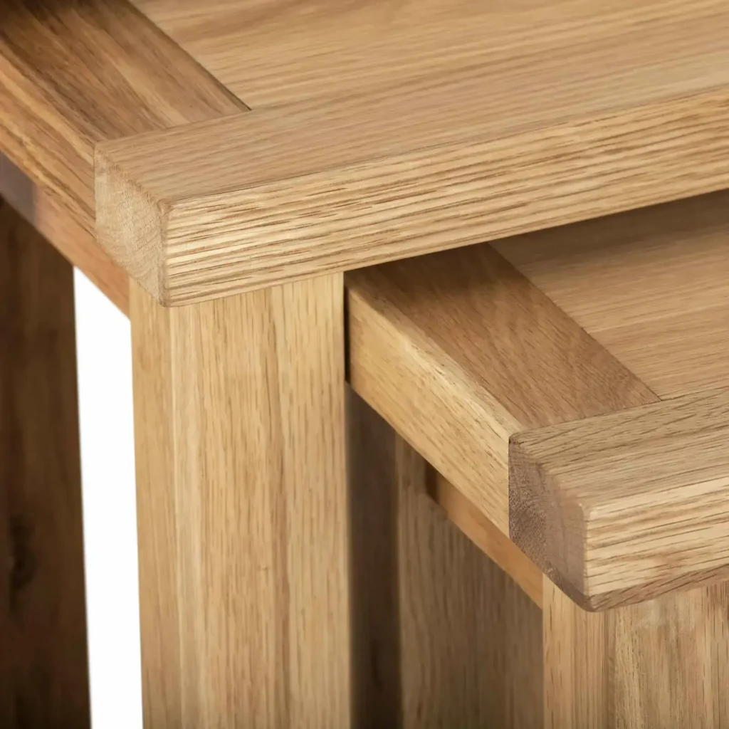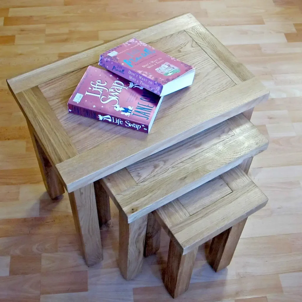 Kvalitné servírovacie stolíky z dubového dreva. Sada dômyselne kompaktných servisných stolíkov vám pomôže vytvoriť tri praktické plochy pri servírovaní občerstvenia vašej návšteve. Naopak pri zloženom tvare na spôsob matriošky servírovacie stolíky nemusia zavadzať naprostriedku obývačky ale napríklad dobre poslúži ako kvetináč alebo stolček vedľa podrúčky vašej pohovky.