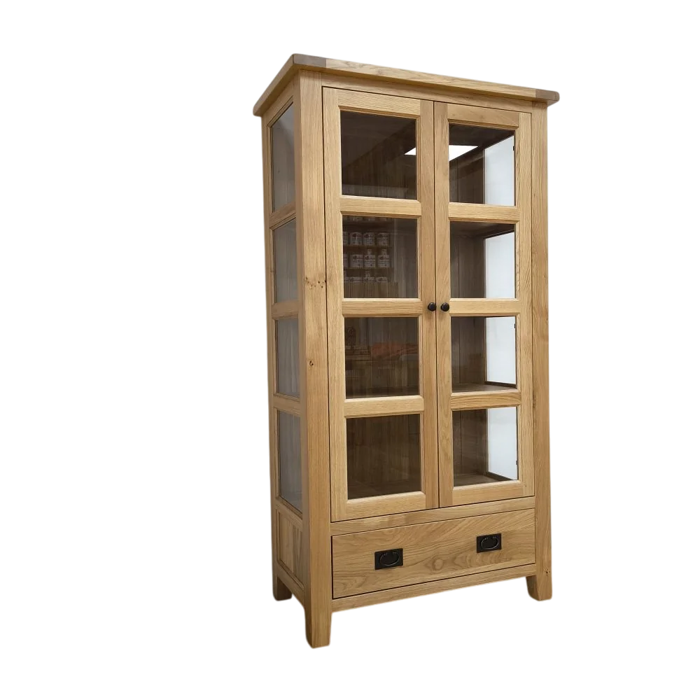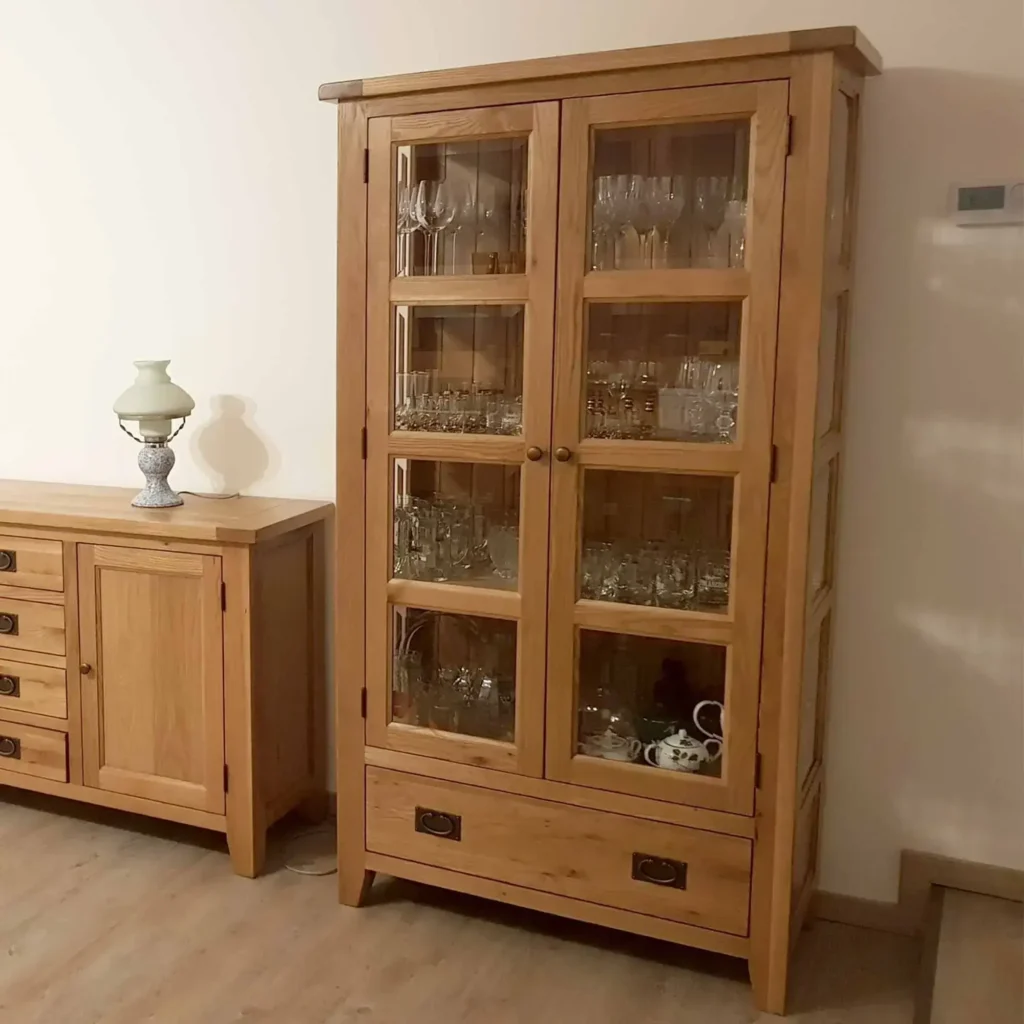 Masívna dubová vitrína s precíznym remeselným spracovaním prináša do domácnosti eleganciu, teplo a pevnosť prírodného materiálu. Sklenené plochy na čelách aj bokoch umožňujú dokonalé vystavenie uložených predmetov zo všetkých uhlov, vďaka čomu sa vitrína ideálne hodí ako vitrína na poháre, porcelán, knihy alebo zberateľské kúsky. Povrch ošetrený transparentným tvrdým voskovým olejom s certifikáciou EN71-3 zaručuje prirodzený vzhľad dreva a zároveň chráni pred znečistením a vlhkosťou. Kvalitné pánty a tiché kovanie zásuvky s dovieraním zaručujú komfortné a bezhlučné používanie.
