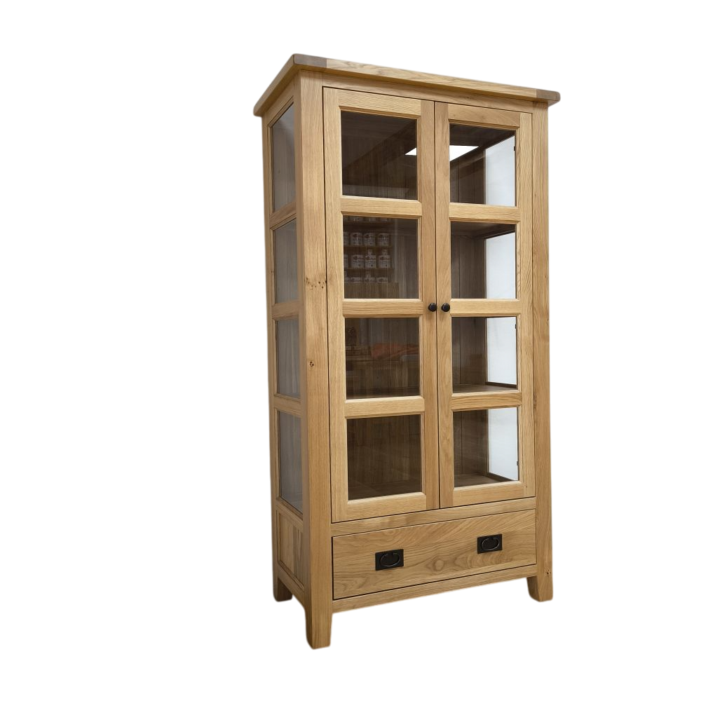 Masívna dubová vitrína s precíznym remeselným spracovaním prináša do domácnosti eleganciu, teplo a pevnosť prírodného materiálu. Sklenené plochy na čelách aj bokoch umožňujú dokonalé vystavenie uložených predmetov zo všetkých uhlov, vďaka čomu sa vitrína ideálne hodí ako vitrína na poháre, porcelán, knihy alebo zberateľské kúsky. Povrch ošetrený transparentným tvrdým voskovým olejom s certifikáciou EN71-3 zaručuje prirodzený vzhľad dreva a zároveň chráni pred znečistením a vlhkosťou.