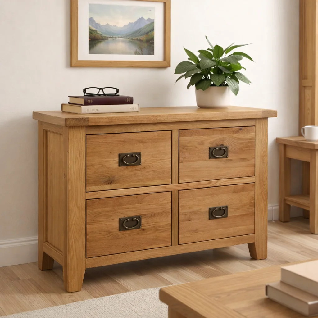 Dubové drevo komody z masívu, vďaka ktorému je nábytok kvalitný a veľmi stabilný, je povrchovo upravené olejom a voskom. Dlhovekosť dubového nábytku je jednou z jeho hlavných výhod a často v domácnostiach pretrvá i niekoľko generácií.