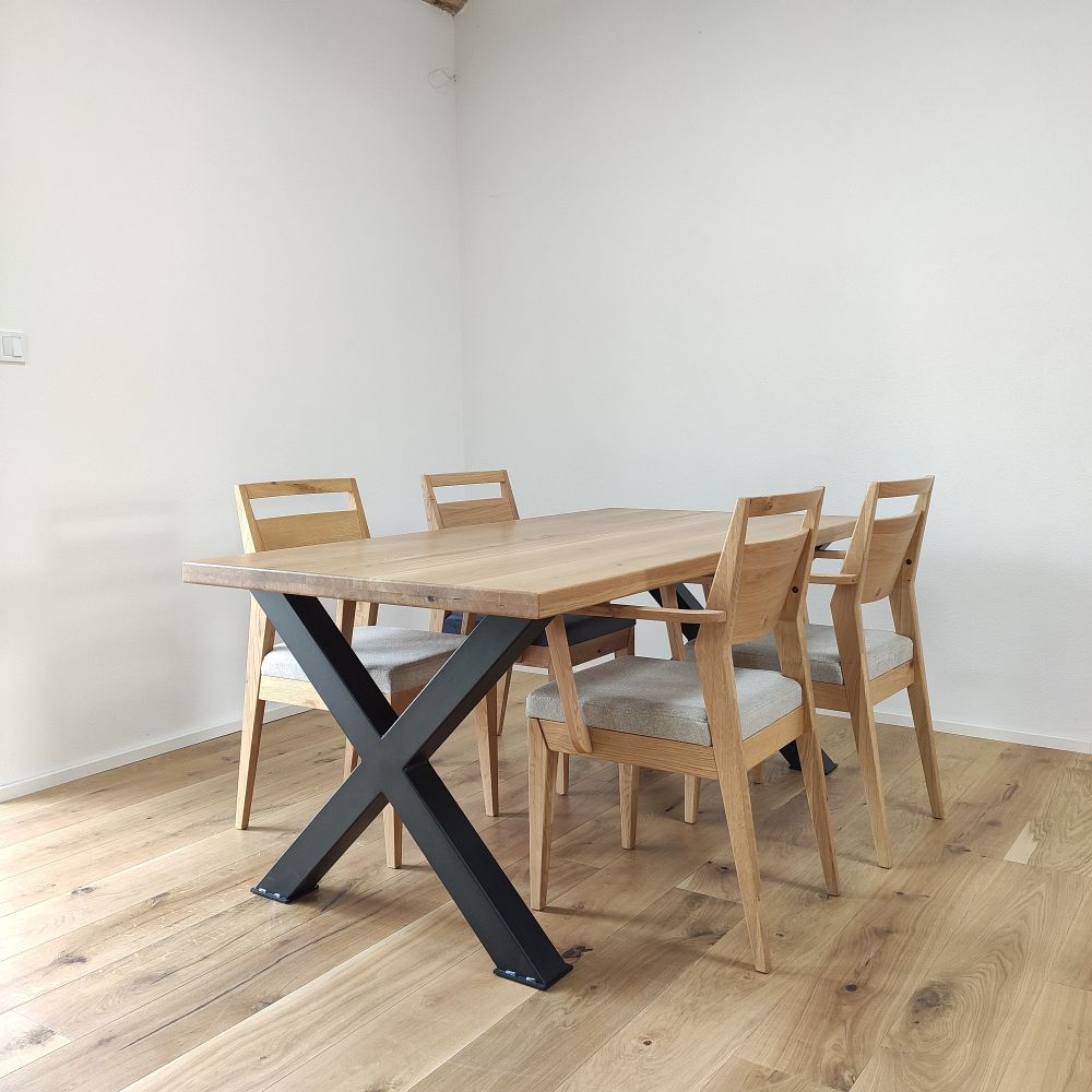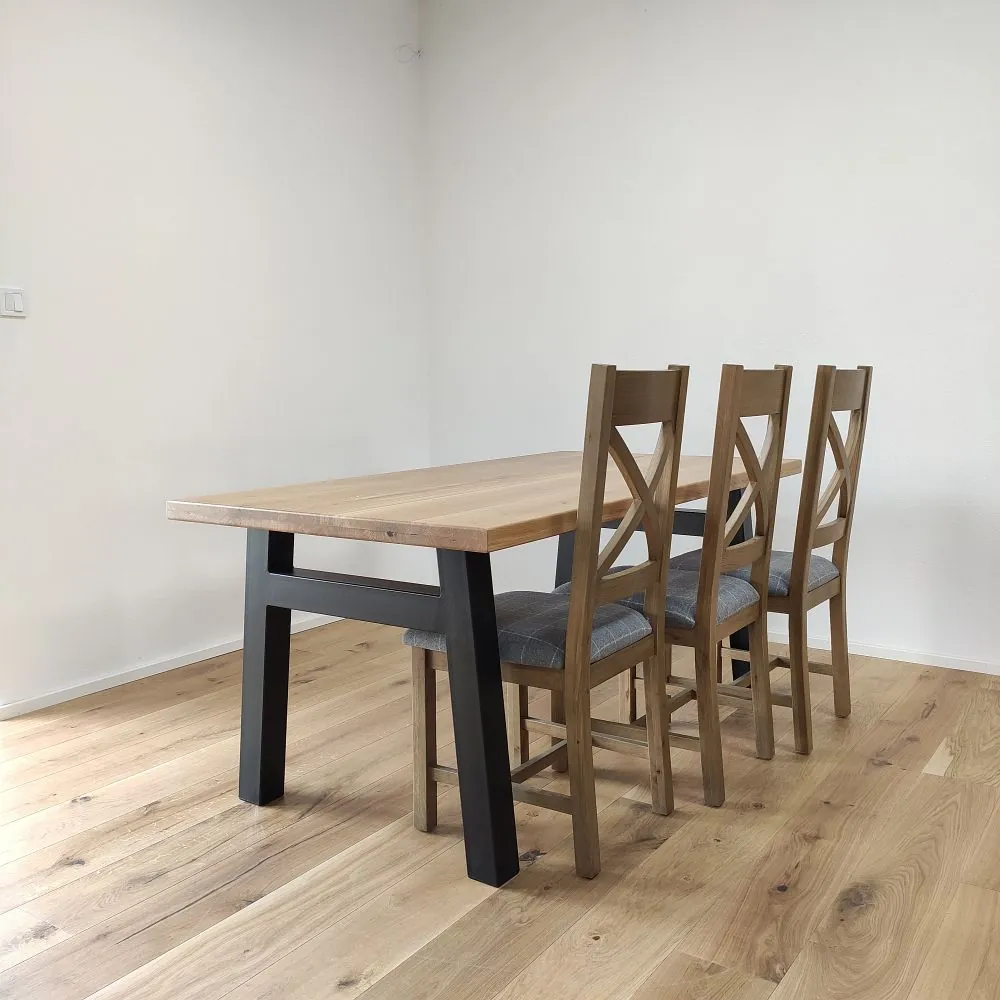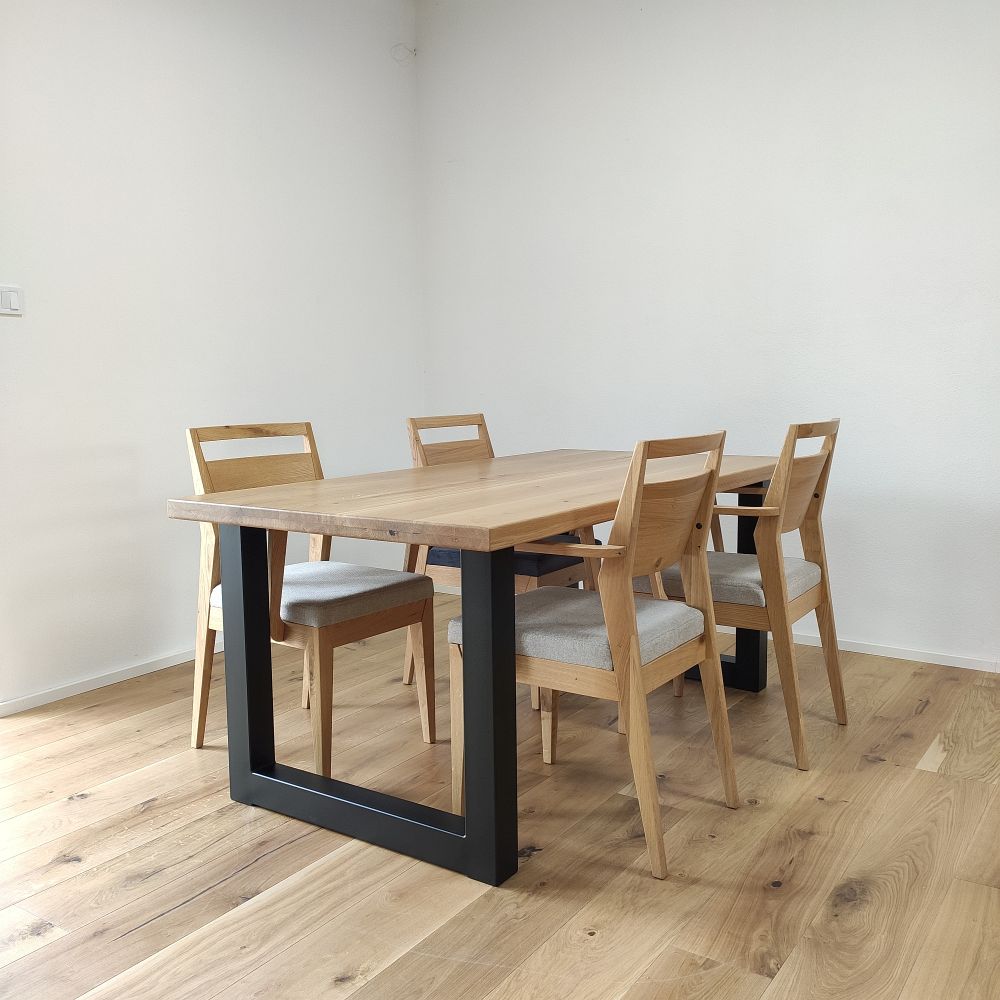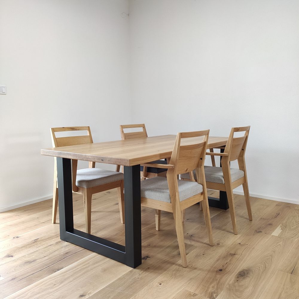 Každá dubová doska (masív) je vyrobená zo starostlivo vyberaného dreva so zachovaním prirodzenej štruktúry a sukov. Štandardná šírka lamiel sa pohybuje medzi 6 až 9 cm, čo dodáva stolovej doske autentický remeselný vzhľad. Povrch je hladko opracovaný, pričom hrany ponechávame v minimalistickom prevedení – ideálne na kombináciu s industriálnymi aj rustikálnymi prvkami.