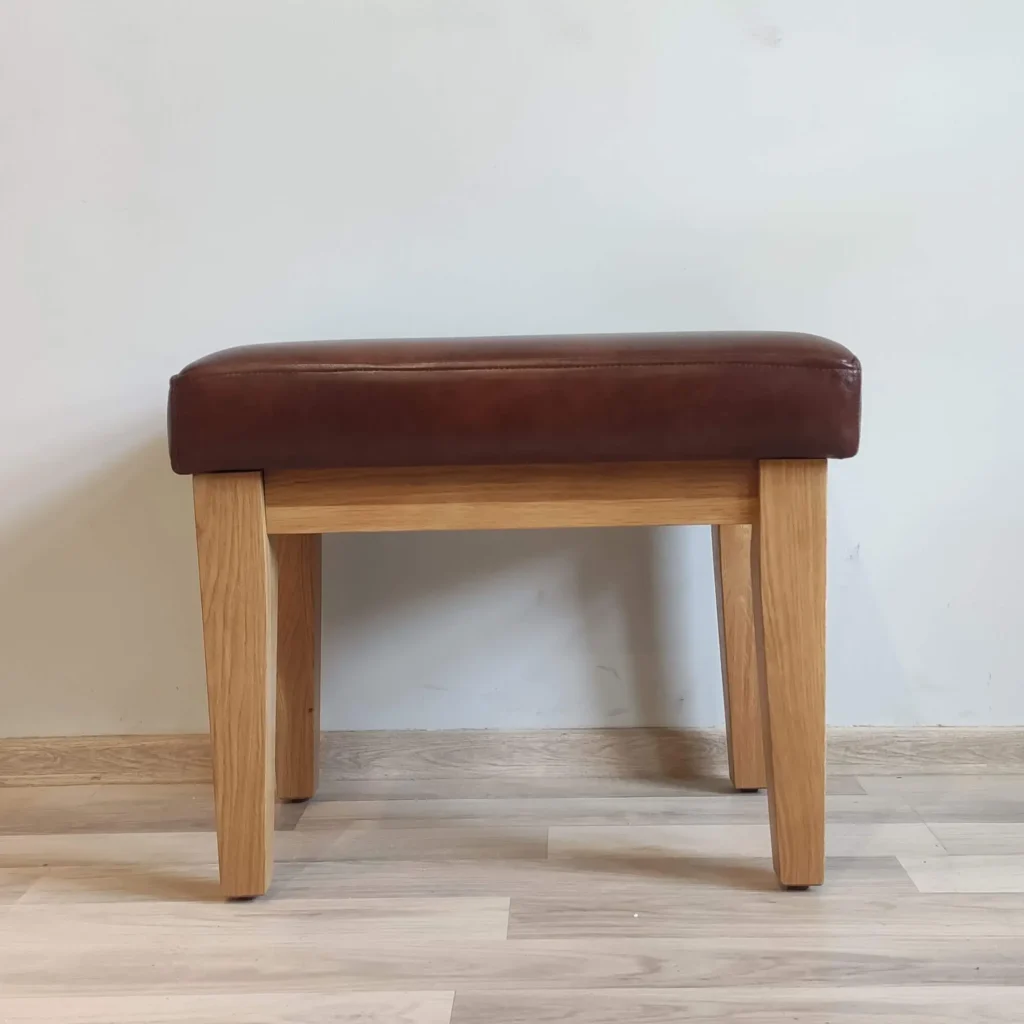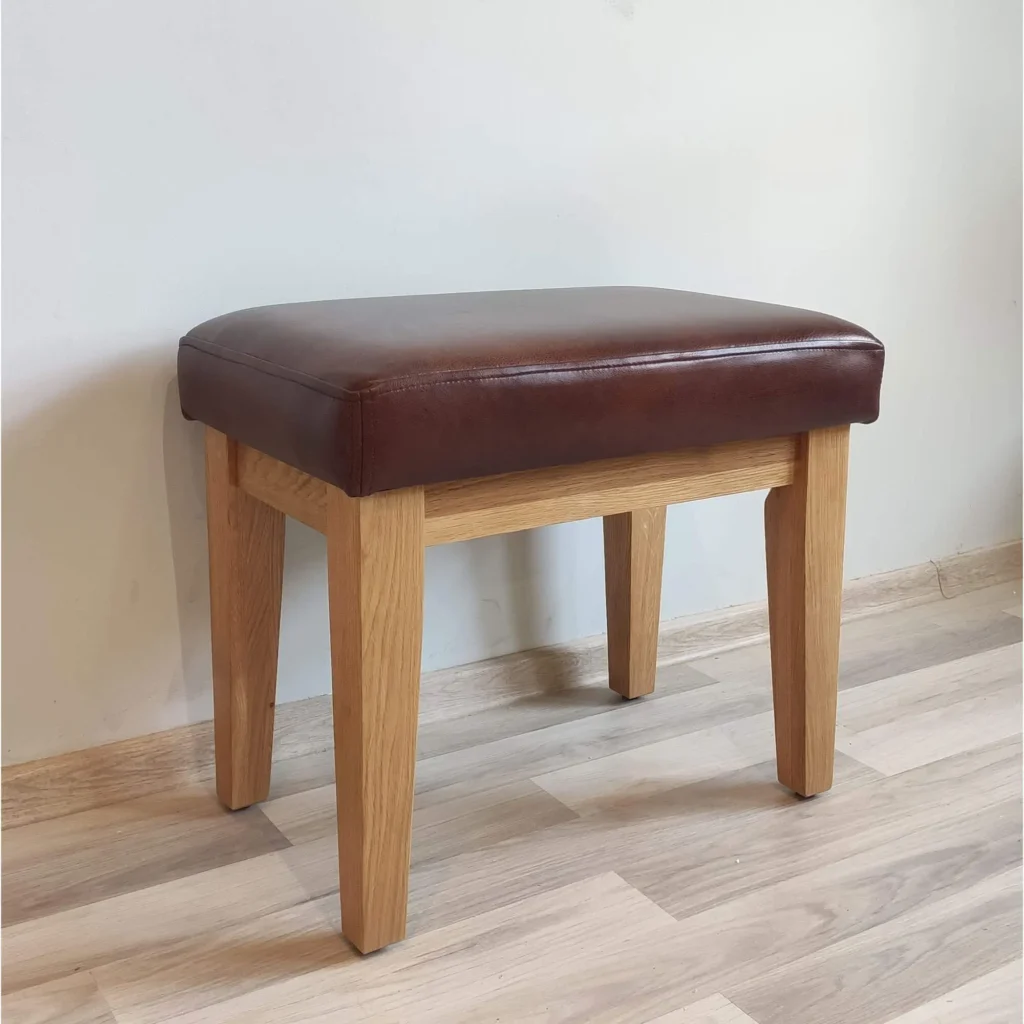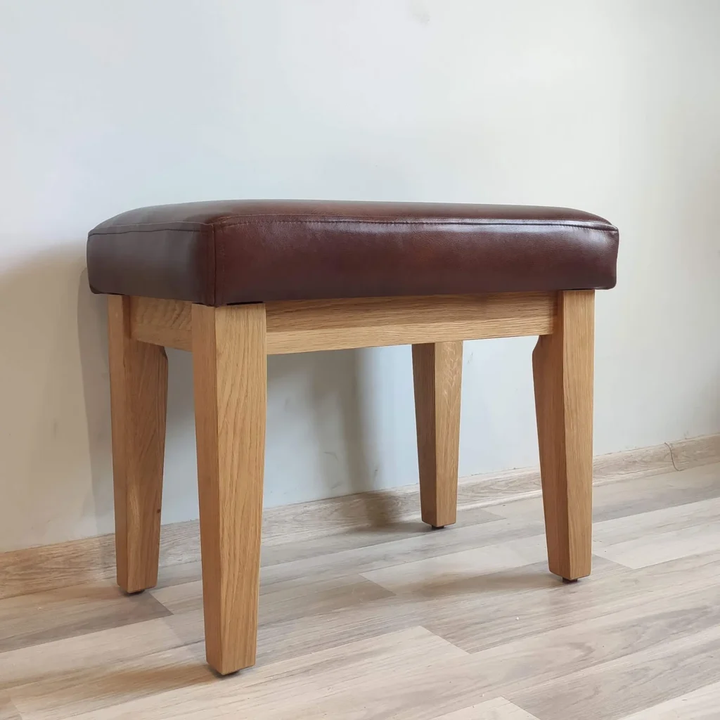 Dubové drevo taburetky z masívu vytvára príjemný kontrast k prvku kože na čalúnenom sedáku, vďaka čomu si napriek malej veľkosti zachováva drahý – elegantný vzhľad. Drevená taburetka má povrch ošetrený zmesou oleja a voskov na prírodnej báze, ktoré na ňom vytvárajú ochrannú vrstvu pred vonkajšími vplyvmi a navyše zvýrazňujú jedinečnú textúru dreva.