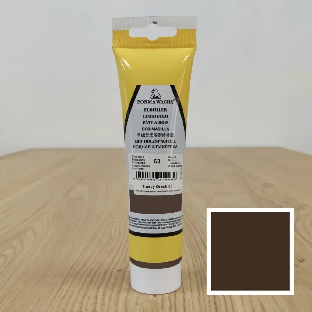 Ekologický tmel na báze vody pre opravu dreva bez zápachu s pigmentom – tmavý orech. Jednozložková pasta na tmelenie rôznych odtieňov dreva s jednoduchou aplikáciou. Tento typ tmelu na drevo je vhodný na ľubovoľný odtieň opravovaného dreva príp. iného podkladu.