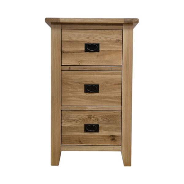 Úzka dubová skrinka s tromi zásuvkami predstavuje praktické riešenie pre uskladnenie predmetov v domácnosti aj kancelárii. Masívna skrinka je vyrobená z kvalitného dubového dreva, ktoré zabezpečuje stabilitu a dlhú životnosť. Konštrukcia stojí na pevných nožičkách, čo uľahčuje údržbu podlahy a zároveň dodáva nábytku odľahčený vzhľad. Vďaka univerzálnym rozmerom sa drevená skrinka hodí do obývačky, spálne, predsiene aj kúpeľne. Hlboké zásuvky ponúkajú dostatok úložného priestoru na bielizeň, hračky, dokumenty alebo iné drobnosti, ktoré je potrebné udržať prehľadne usporiadané.