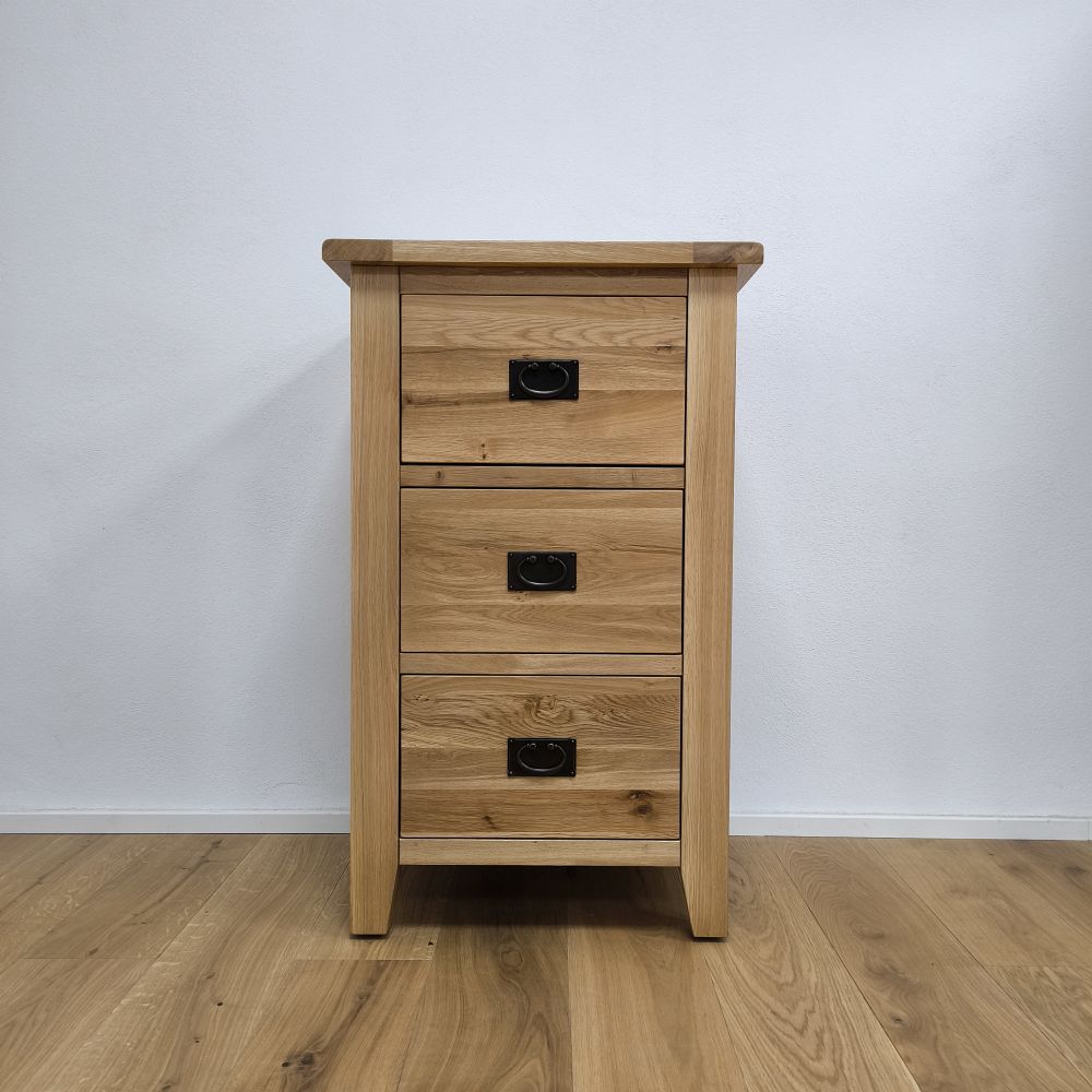Úzka dubová skrinka s tromi zásuvkami predstavuje praktické riešenie pre uskladnenie predmetov v domácnosti aj kancelárii. Masívna skrinka je vyrobená z kvalitného dubového dreva, ktoré zabezpečuje stabilitu a dlhú životnosť. Konštrukcia stojí na pevných nožičkách, čo uľahčuje údržbu podlahy a zároveň dodáva nábytku odľahčený vzhľad. Vďaka univerzálnym rozmerom sa drevená skrinka hodí do obývačky, spálne, predsiene aj kúpeľne. Hlboké zásuvky ponúkajú dostatok úložného priestoru na bielizeň, hračky, dokumenty alebo iné drobnosti, ktoré je potrebné udržať prehľadne usporiadané.