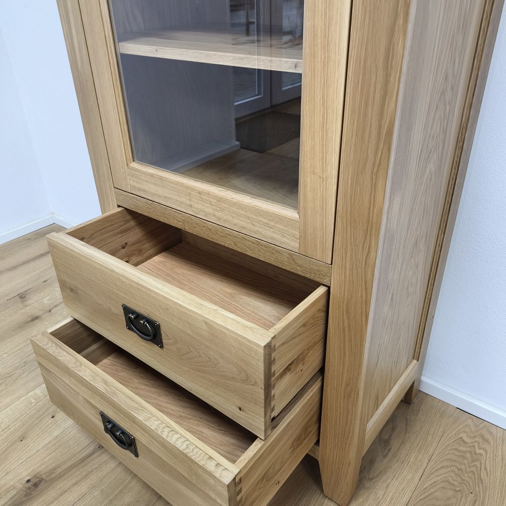 Dve priestranné zásuvky v spodnej časti vitríny sú celo-drevené a spájané tradičným rybinovým spojom, čo zaručuje ich pevnosť a dlhú životnosť. Ložiskové kovové výsuvy zabezpečujú plynulý chod zásuviek a praktické samo-dovieranie, ktoré ocení každý používateľ.
