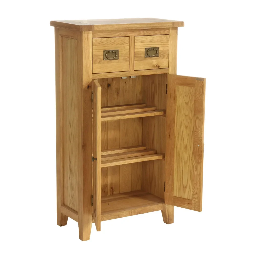 Šikovný a nie veľmi široký botník s dvierkami je ideálny pomocník na odkladanie topánok ale aj kľúčov či drobných predmetov, ktorý je vhodný doplnkový nábytok aj ako malá skrinka nielen do predsiene. S výškou cez 1,2 m má tento úzky botník s dvierkami ideálne rozmery nielen pre odkladanie topánok. Vďaka dvom zásuvkám a pohotovostnej výške je ideálny na odkladanie drobných predmetov ako sú kľúče či drobné predmety z Vašej chodby. Botník za dvomi dvierkami ukrýva tri praktické police na topánky.