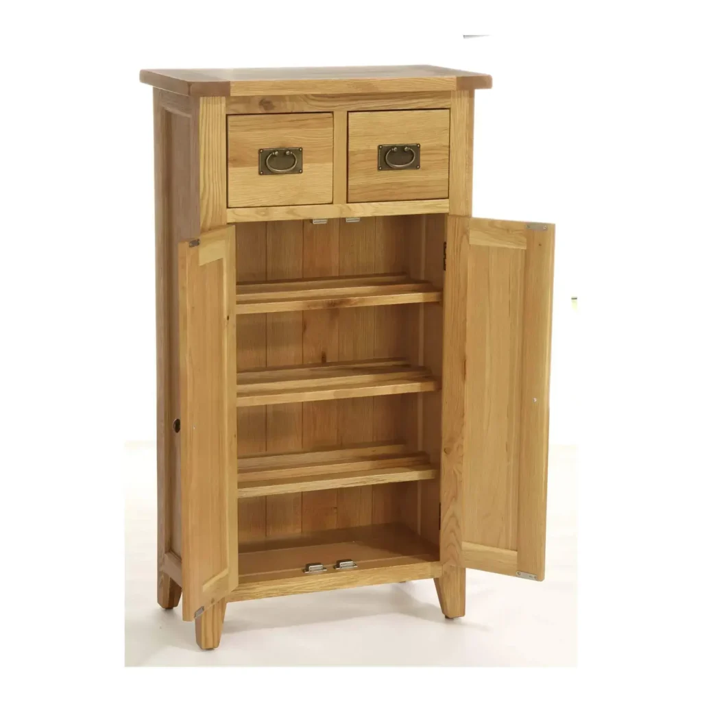 S výškou cez 1,2 m má úzky botník s dvierkami ideálne rozmery nielen pre odkladanie topánok. Vďaka dvom zásuvkám a pohotovostnej výške je ideálny na odkladanie drobných predmetov ako sú kľúče či drobné predmety. Botník za dvomi dvierkami ukrýva tri praktické police na topánky.
